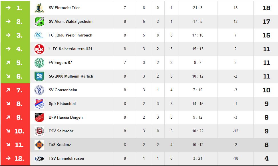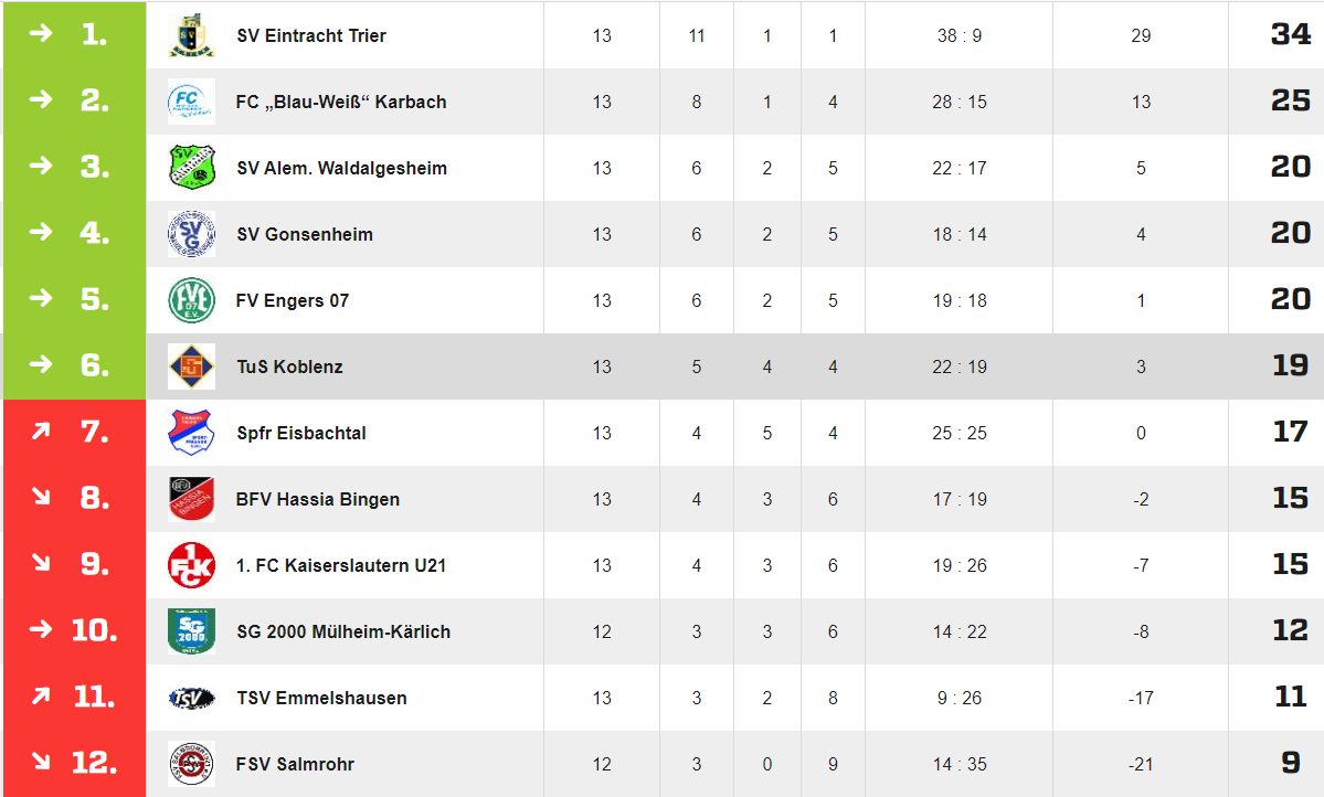 Die Tabellensituation sieht jetzt auch schon wieder besser aus. Aktuell Platz 6 mit 2 Punkten Vorsprung auf Platz 7. Am Mittwoch kommt der vorletzte aus Emmelshausen ins Oberwerth. Hier sind 3 Punkte Pflicht und dann sollte man ein kleines Polster haben. Mittlerweile ist man auch seit 7 Pflichtspielen ungeschlagen.