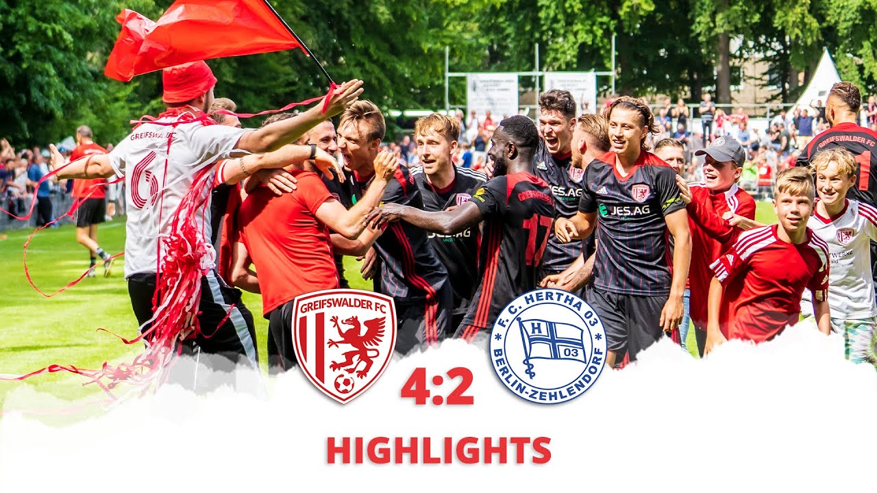 Nicht verwirren lassen, Greifswald (Vereinsfarben rot und weiß) spielt in schwarz, damit Hertha (eigentlich ganz in blau) auf rot ausweichen muss.