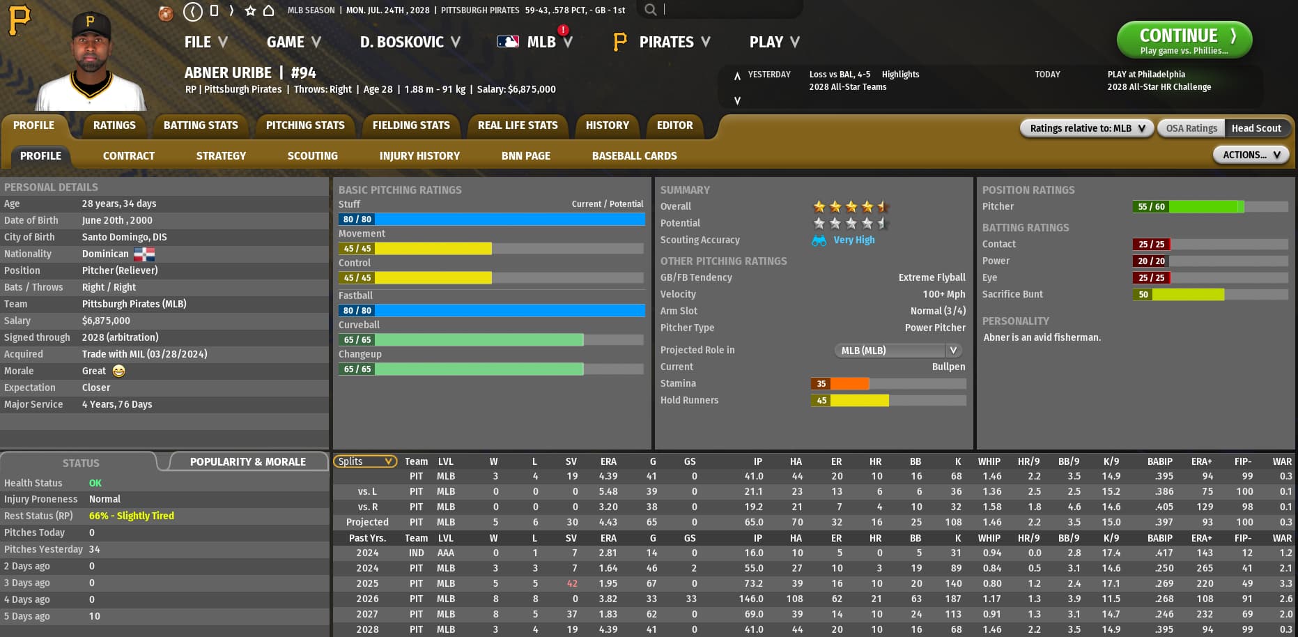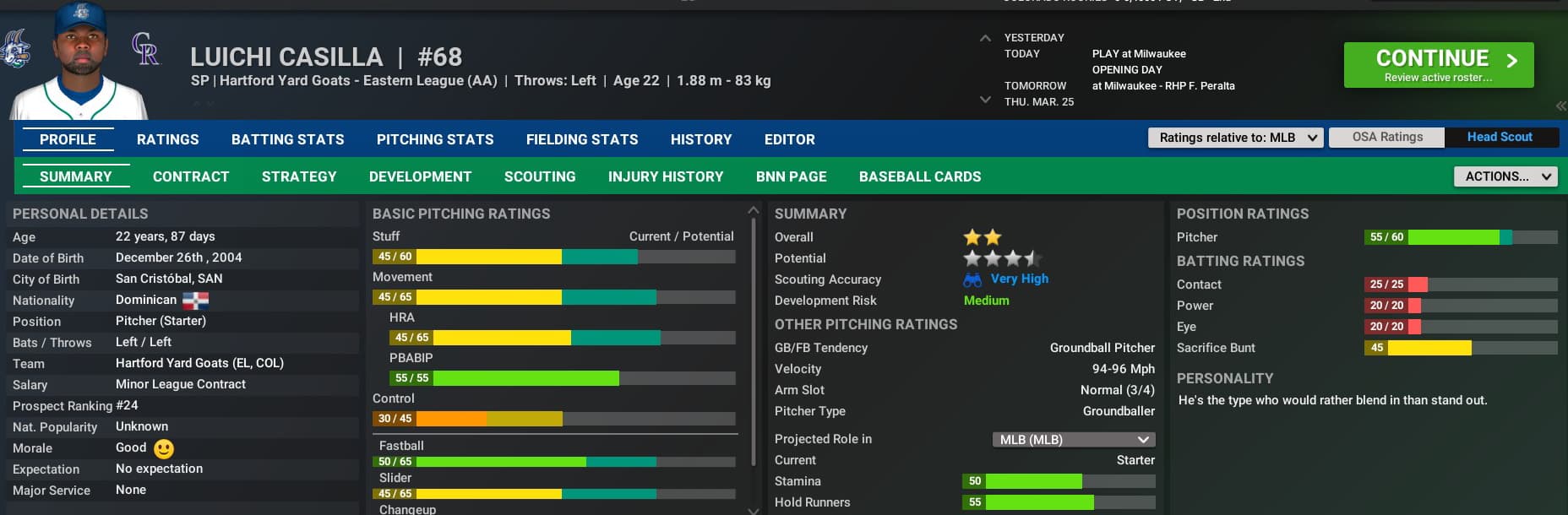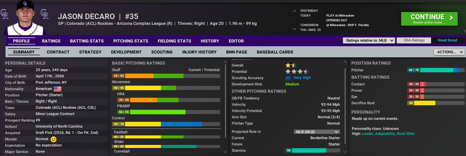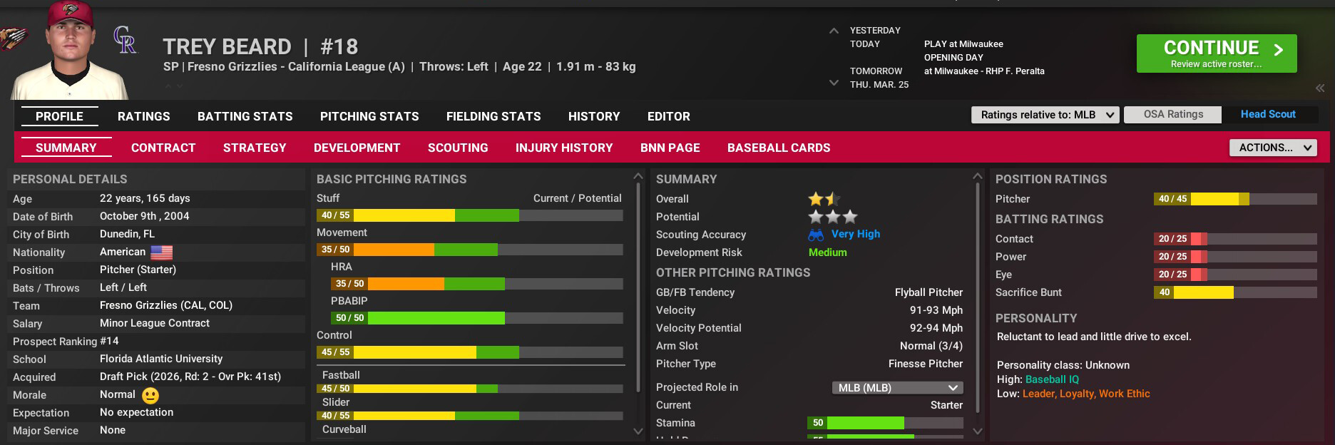Hier könnte nur die Control ein Problem werden. 45 wäre für einen Starter schon extrem hart an der Grenze und nur zu kompensieren, wenn er sich bei seinem Stuff voll entwickelt. Dafür ist er ein Groundball Pitcher, was im Coors Field immer ein Plus ist.