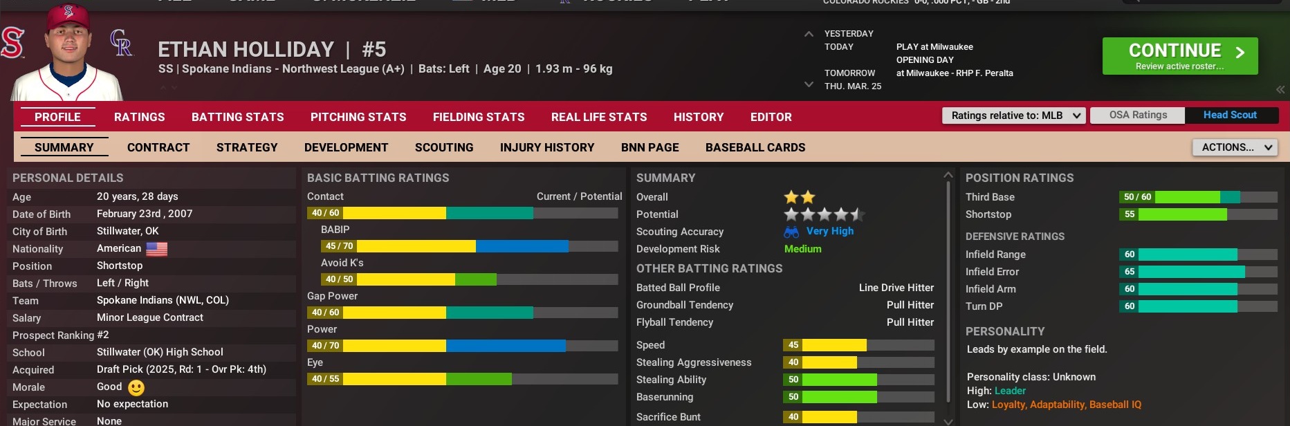 Mit Shortstop Ethan Holliday (Sohn von 7x AllStar Matt Holliday und Bruder von Orioles Talent Jackson Holliday) habe ich den Shortstop der Zukunft schon im eigenen Haus. Er wurde tatsächlich dieses Jahr „in Echt“ von den Rockies gedraftet und da ich einen Live-Start gespielt habe, befindet er sich in meinen eigenen Reihen.