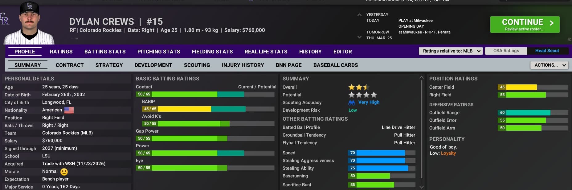 Die Washington Nationals haben mir zudem einen interessanten Trade angeboten, bei dem ich nicht nein sagen konnte. Abgeben musste ich mit Catcher Hunter Goodman zwar meinen besten Spieler, aber da ich mit Drew Romo bereits einen jungen Ersatz habe, der zwar offensiv nicht ansatzweise so gut ist, dafür aber alles mit seiner Defensive überragt, konnte ich im Gegenzug Dylan Crews bekommen.