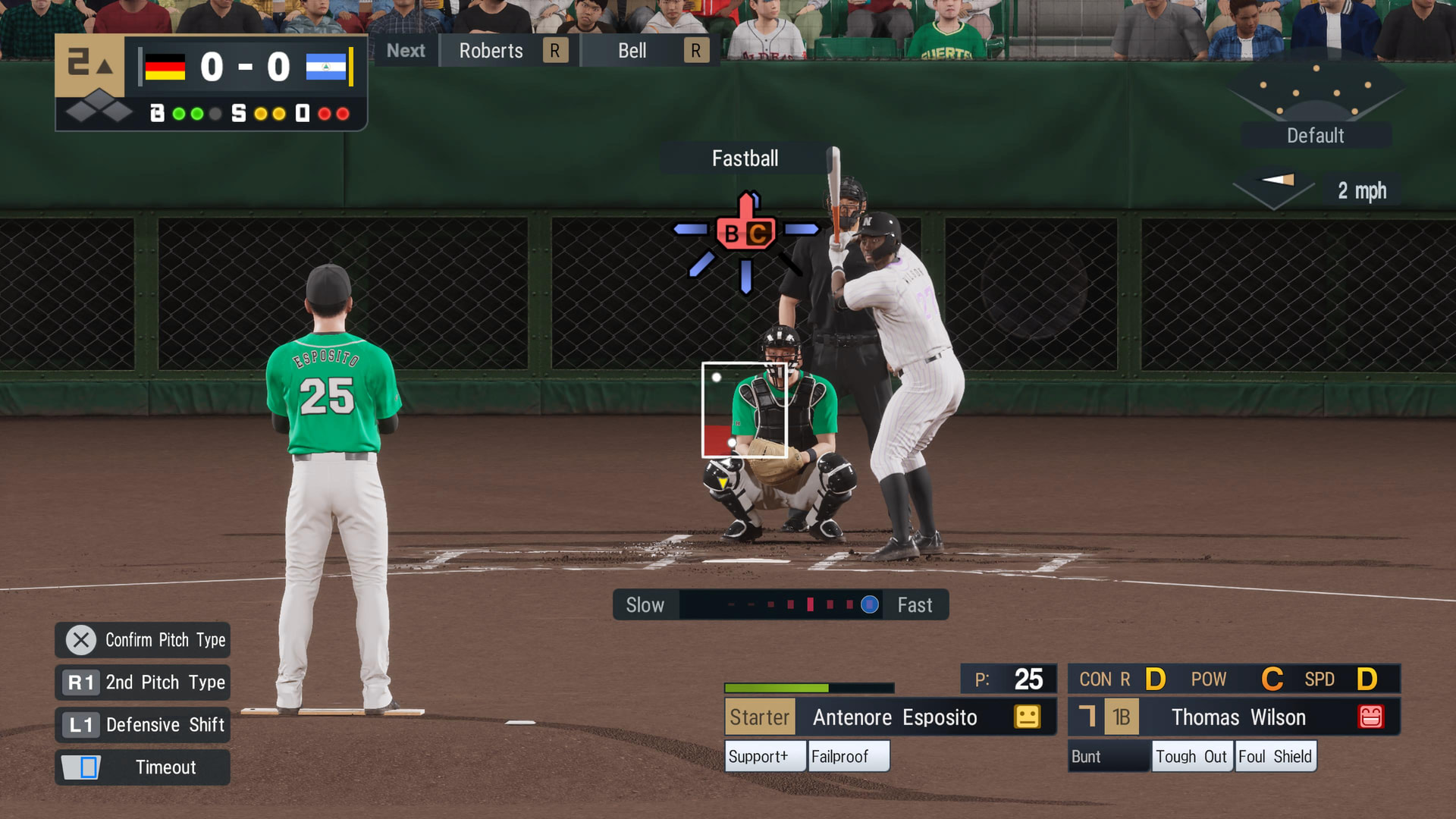 Der Balken unter dem Batter zeigt nämlich an, auf welchen Pitch der Batter zurzeit fokusiert ist. Wirft man z.B. einen Fastball, geht die Leiste ganz nach rechts, weil der Batter gerade einen Fastball gesehen hat und sein Timing auf diesen Pitch eingestellt hat. Wirft man einen Breaking Ball, ist sein Auge eher auf diesen langsameren Pitch eingestellt und man kann ihn mit einem Fastball überraschen. Das ist eine sinnvolle und realistische Mechanik, bei der ich nicht weiß, ob sie in der Form bei MLB The Show existiert. Ein weiteres cooles Feature ist die „Power“ Variante, den man für jeden Pitch auswählen kann. Im Prinzip bedeutet das, dass der Pitcher sich für diesen Pitch besonders fokussiert und alles aus sich herausholt. Dieser wird mit noch mehr Kraft/Break geworfen, zieht aber auch bedeutend mehr Energie aus dem Pitcher. Auch das finde ich realistisch. Du hast Full Count und musst alles reinwerfen, um den Batter auszustriken? → Power Pitch. Bases Loaded und du musst unbedingt aus dem Inning kommen → Power Pitch. Der Pitcher nähert sich dem Ende seines Auftritts und leert den Tank → Power Pitch. Natürlich kann man den nicht immer spammen, da die Energie dann schnell runtergeht. Aber es ist einfach sehr realistisch, weil es genau so auch in Echt ist. Ein Pitcher holt für die wichtigen Momente immer noch ein paar Prozente mehr aus sich heraus.