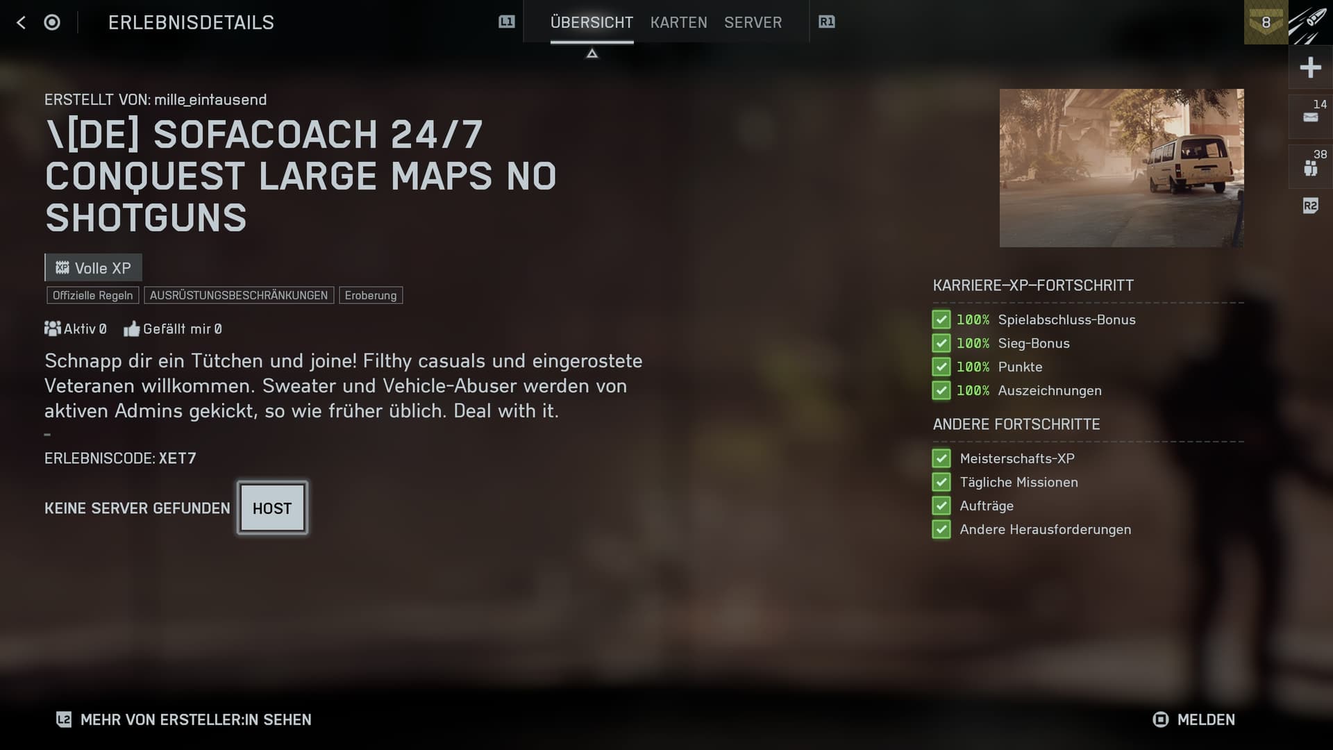 Die Freischaltungen dürften bei COD-Spielern und 6-fachen Vätern mit 4 Jobs für Stirnrunzeln sorgen: Dat dauert alles schon unfassbar lang. Man sollte sich wohl um die 2XP-Challenges bemühen und die Token dementsprechend rausballern und BF dürfte in Zukunft auch regelmäßig 2XP-Wochenenden haben. Ich habs lieber so, als das ich zugeschissen werde mit Stuff und nach 1 Monat eigentlich nur der Camogrind bleibt, der mich nicht interessiert.