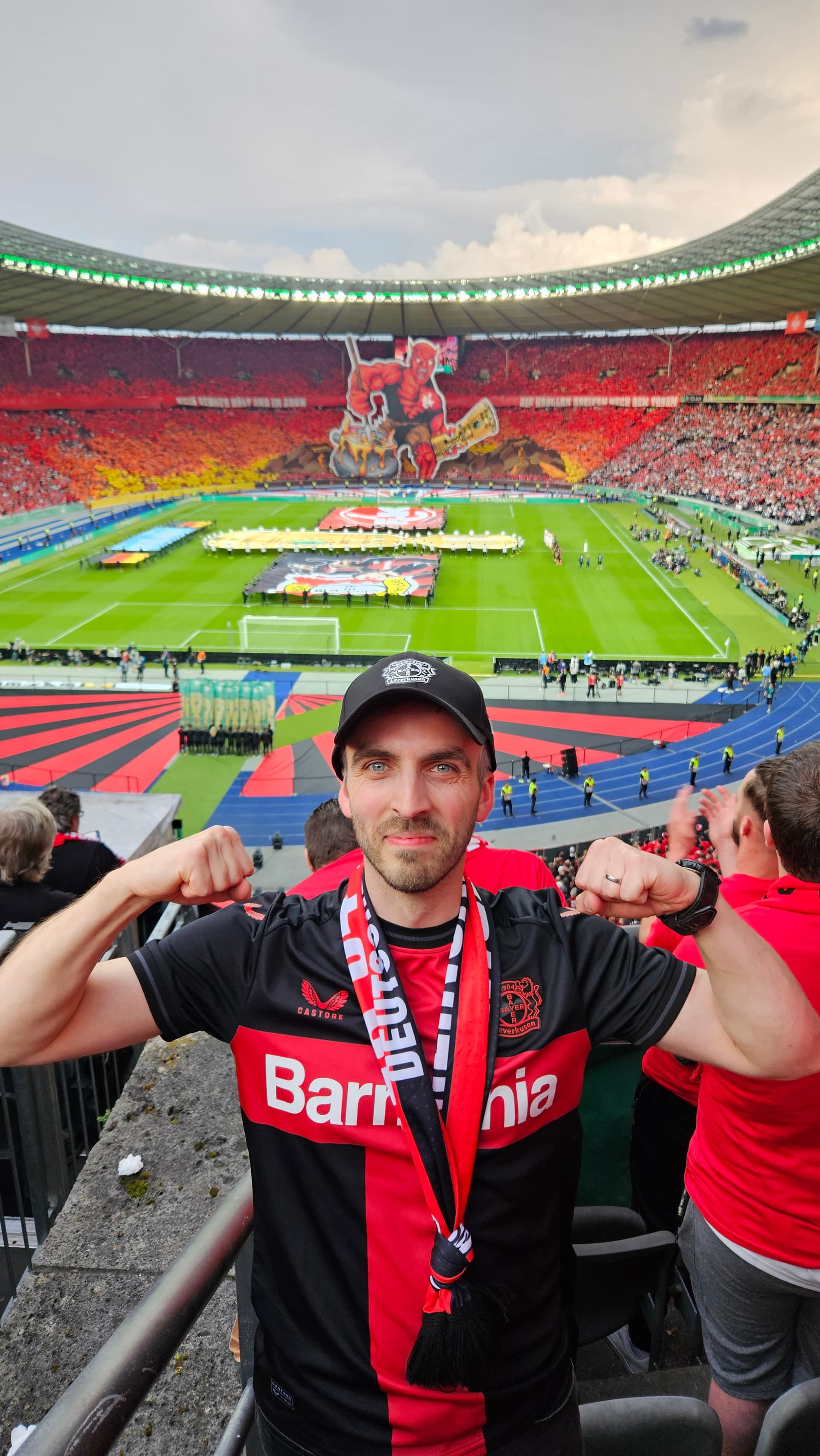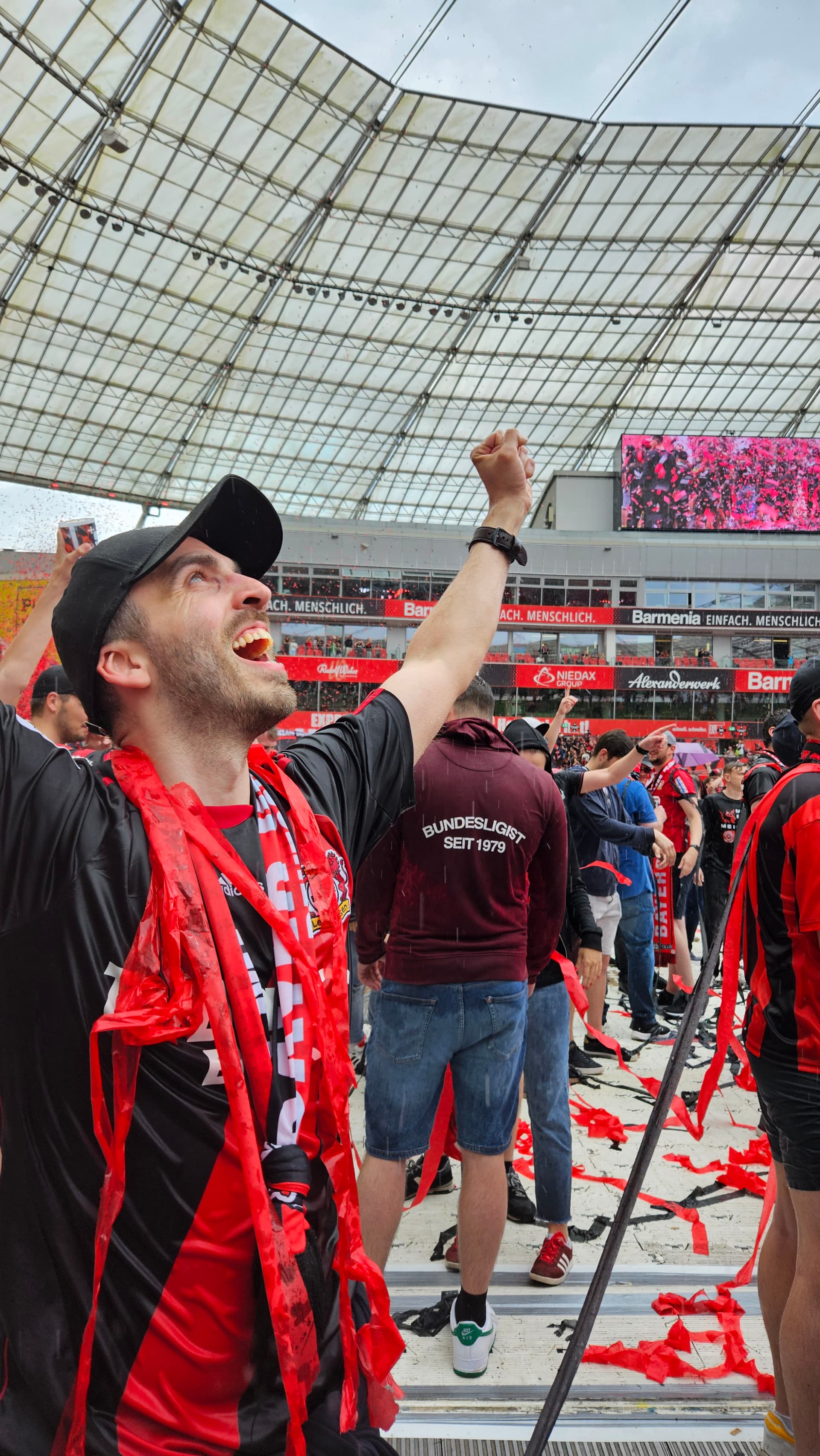 Ich freue mich zudem riesig, dass nun gestern auch endlich alle diese Sensationssaison feiern konnten im Verein und hoffe, dass sie einigermaßen trinkfest sind, damit die Party heute weitergehen kann mit uns Fans und das möglichst lang. Ich hatte in all den Jahren immer diese Vorstellung oder viel mehr diesen Wunsch, dass wir das als Leverkusener auch mal am Ende der Saison miterleben dürfen, die Mannschaft ausgelassen feiern zu sehen mit einem Titel im Gepäck und jetzt sind es sogar zwei und das als national ungeschlagener Double-Sieger. Es ist einfach unbeschreiblich. Von daher geht jetzt der lange Fußmarsch aus dem Bergischen Richtung Opladen los und dann über die Bismarckstraße ins Stadion. Habt alle ganz viel Spaß und genießt diesen wundervollen Tag mit unserem Bayer.