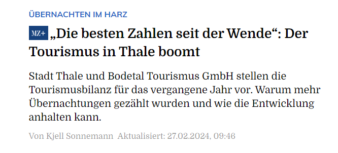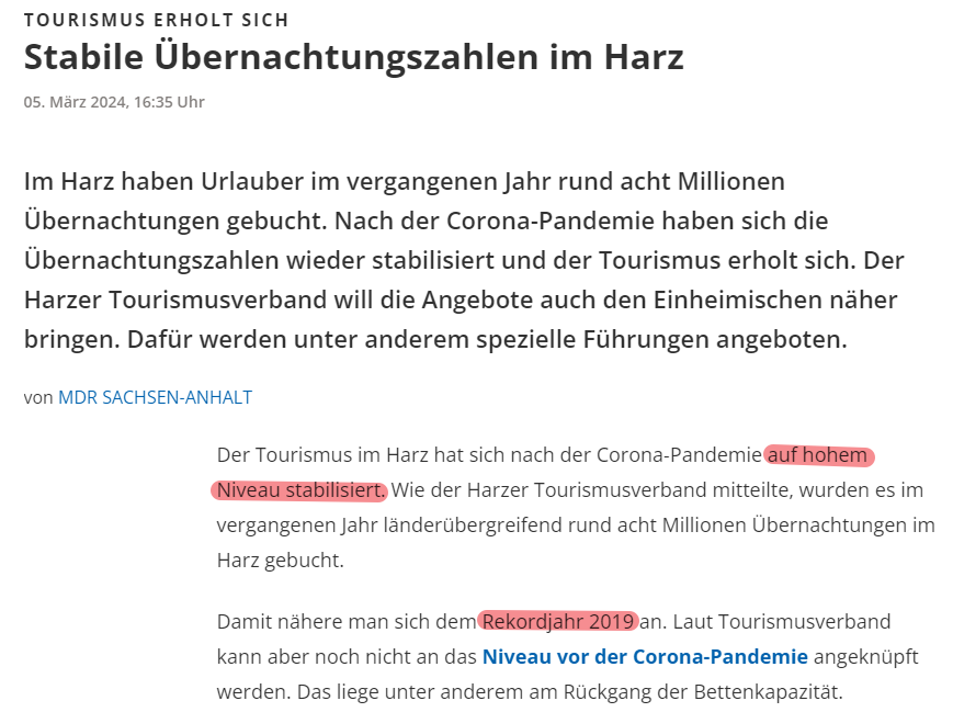 „In den ersten sechs Monaten dieses Jahres seien im gesamten Harz rund 3,6 Mio Übernachtungen gezählt worden. Allerdings würden nur Beherbergungsbetriebe ab 11 Betten gezählt, da nur diese zur Abgabe statistischer Zahlen verpflichtet seien. Der hervorragend gebuchte Sommer 2022 sei nicht vergleichbar, weil aufgrund von Unsicherheiten sehr viele ihren Urlaub im Inland verbracht hätten, die sonst ins Ausland gefahren wären. Sie sei relativ zufrieden mit diesen Zahlen. Sorgen bereiteten ihr ganz andere Dinge, sagt sie.“