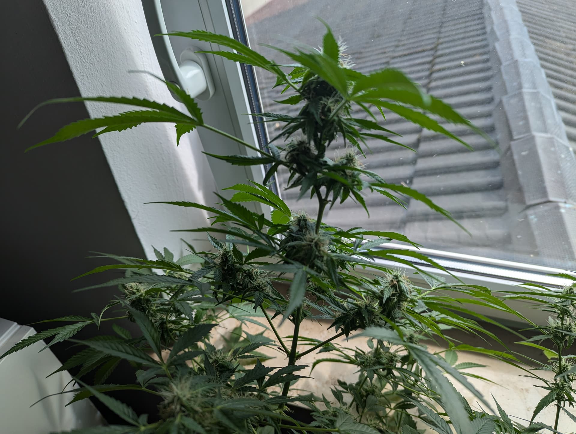 Autoflower „THC Victory“ von Dutch Passion, eine recht neue Entwicklung mit THCV und recht wenig THC. Woche 10. 15 Liter Töpfe. Aufwand? Gießen alle 2 Tage. Kein Dünger. Kein zusätzliches Licht. In 9 Tagen wird der Hauptstamm abgeschnitten und sie kommen kopfüber an einen Kleiderbügel.
