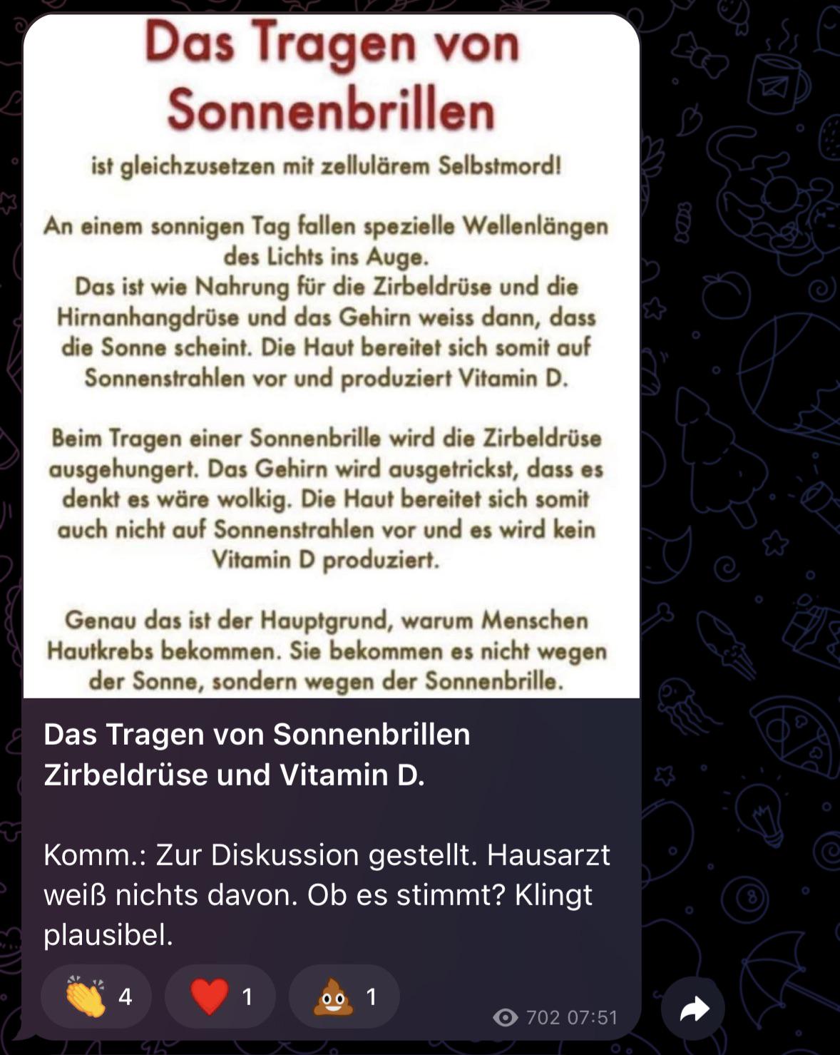 Ich frage mich, warum es als Schwurbler immer direkt so extrem krude werden muss - warum gleich der Bezug zu Hautkrebs, wenn bei Sonnenbrillen doch viel eher der Melatonin/Serotonin Spiegel ein Problem werden könnte und da selbst Studien nicht immer eindeutig sind?