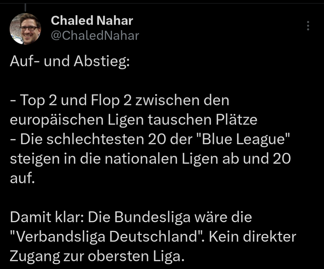 Dass man diesen Bumms echt weiterhin „European“ Super League nennt. Als ob da ohne die Saudi Vereine was laufen wird. Und wenn diese Grenze erstmal geknackt wurde dann steht auch anderen Nationen nichts im Wege - solange man Geld hat, natürlich. Austragungsorte in den USA, China und Arabien inkl.