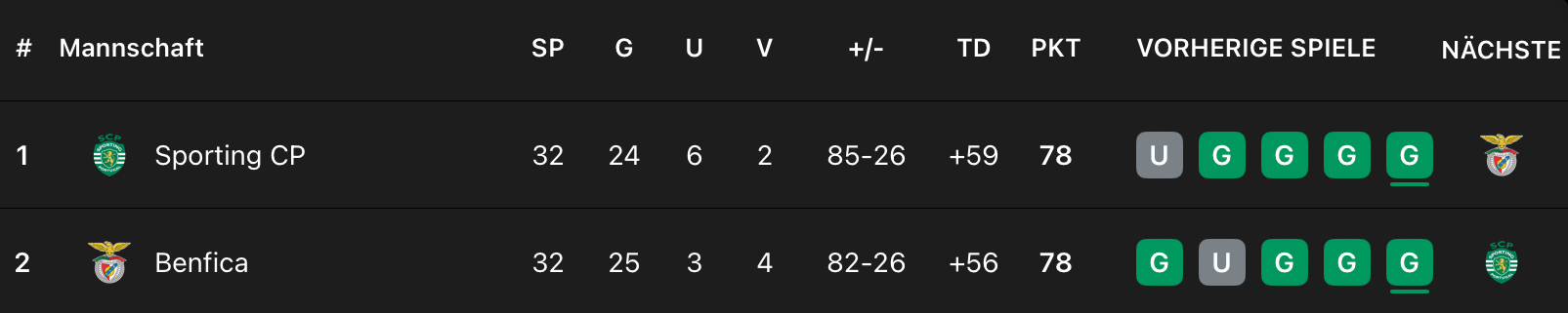 Das wird wohl heute in Portugal um 19 Uhr ein hitziges Spiel zwischen Sporting und Benfica. Das wäre es wohl sowieso, doch es sind (mit diesem Spiel) noch zwei Spieltage und beide Teams haben 78 Punkte.