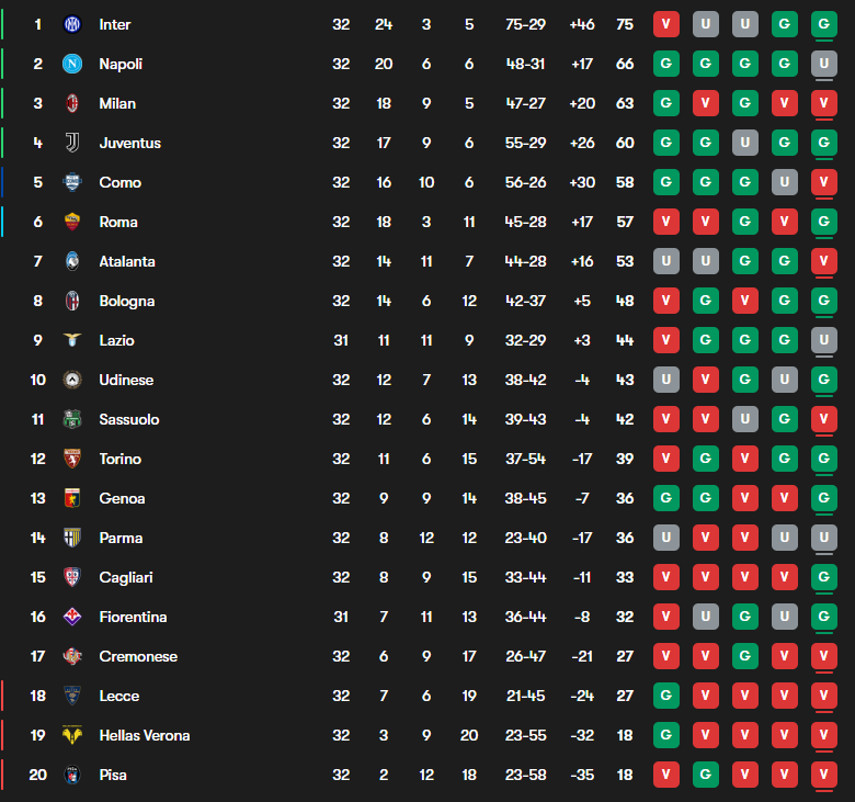Die Meisterschaft ist quasi entschieden. Como als große Überraschung in den Internationalen Plätzen und die Fiorentina nicht mehr in aller höchster Abstiegsnot aber noch nicht komplett sicher.