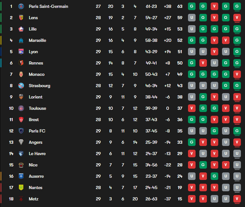 Alles beim alten in Frankreich. PSG bekommt frei vor CL Spielen und bleibt trotzdem auf der 1. Verfolger Lens hat am Wochenende leider verloren und dürfte, sollte man das direkte Duell gegen PSG nicht gewinnen, die Meisterträume wohl begraben.