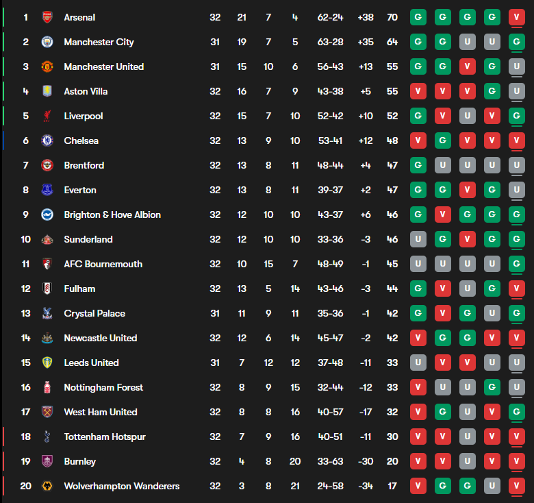 Warum wird gerade so auf Arsenal rumgehackt? Laut der Grafik oben, haben die doch in den letzten 5 Spielen den Vorsprung auf Man City sogar ausgebaut?