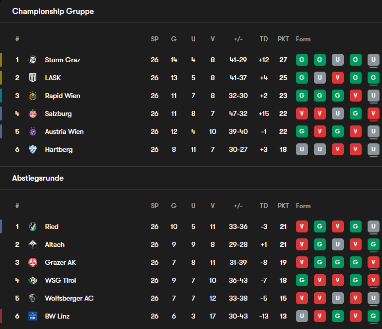 In Österreich schwingt sich Sturm auf der neue Serienmeister zu werden. Es wäre bereits die dritte Meisterschaft in Folge. Der LASK lauert aber. Rapid nach dem Remis im Derby gestern wohl nur noch mit Außenseiterchancen.