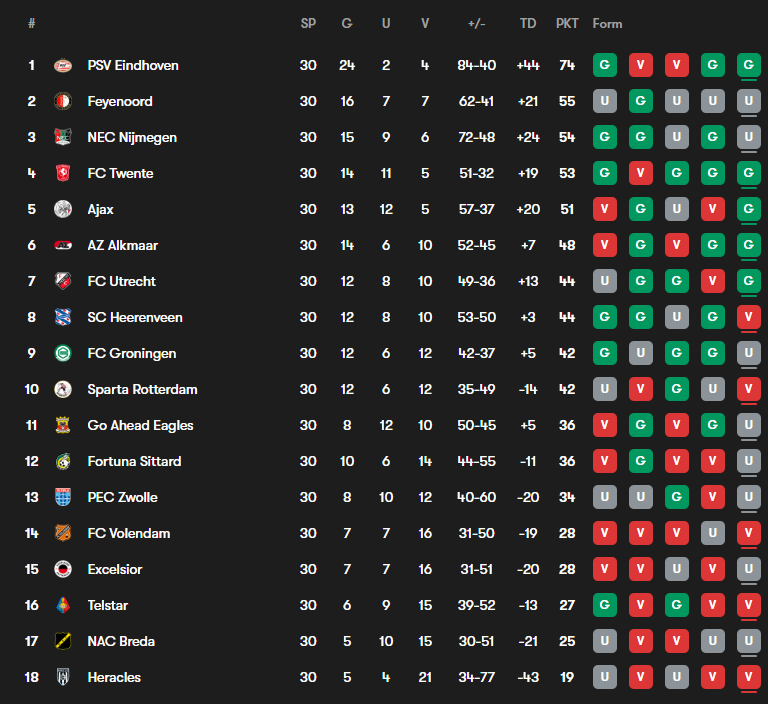 In den Niederlanden ist die PSV schon ganz offiziell Meister. Dafür bleibt es spannend um die Plätze 2-5.