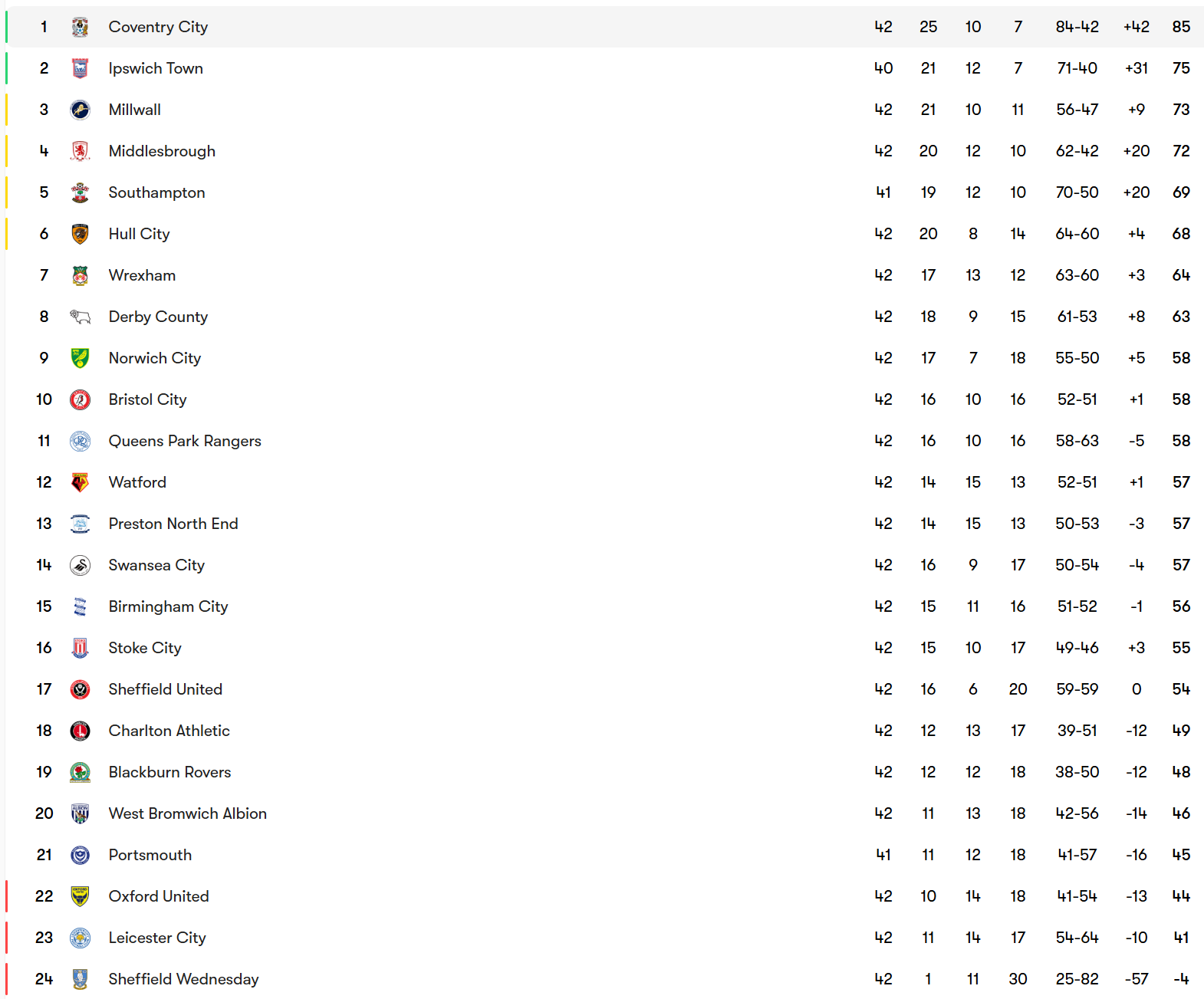 Was man in der Hinsicht noch erwähnen kann. Während Coventry City nach 25 Jahren in die Premier League zurückkehrt sieht es für Leicester hingegen ganz ganz finster aus in der Championship…