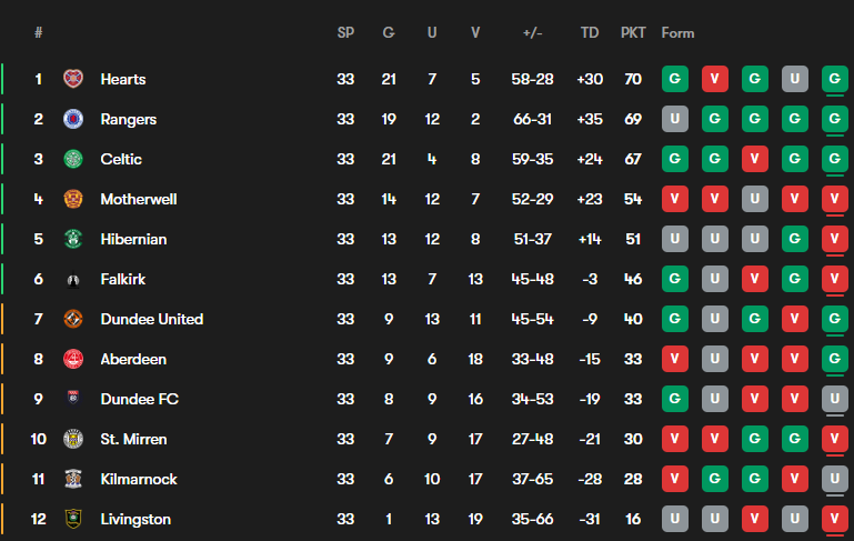 In Schottland bahnt sich ein Dreikampf an. Hearts weiter vorne aber nur noch einen Punkt vor den Rangers. Auch Celtic hat sich wieder gefangen und liegt nur drei Punkte hinter den Hearts.