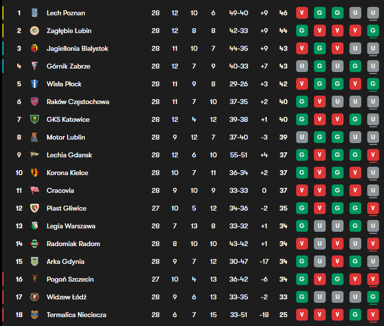 Platz 1 bis 7 trennen gerade mal 6 Punkte. Das große Legia Warschau hängt noch immer ganz tief drin im Abstiegsstrudel.