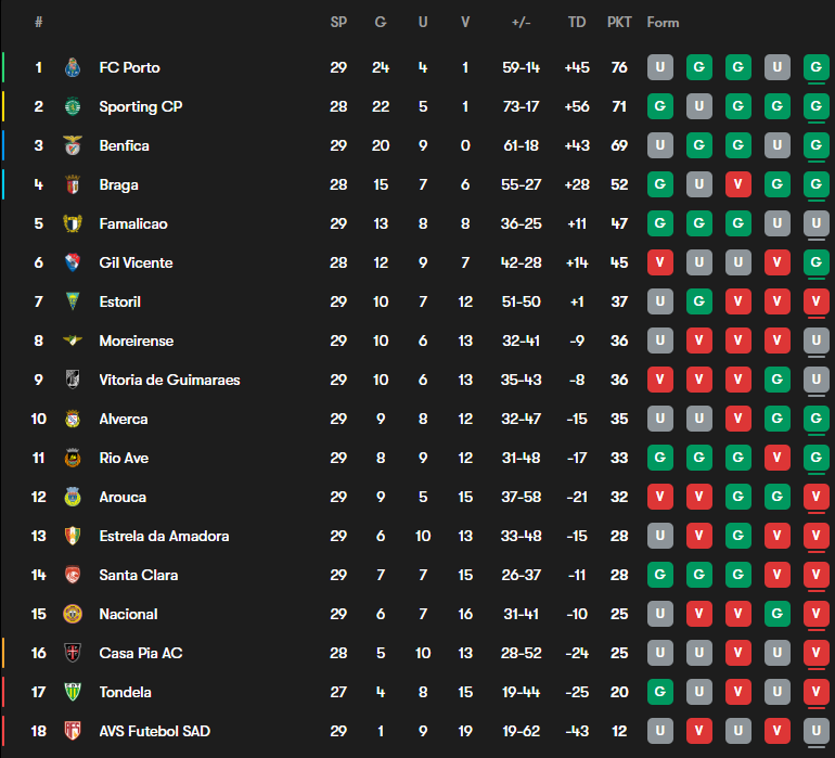 Porto 5 Punkte vor Sporting. Sporting allerdings noch mit einem Spiel in der Hinterhand. Für eine Benfica Meisterschaft müsste ein mittelschweres Wunder passieren.