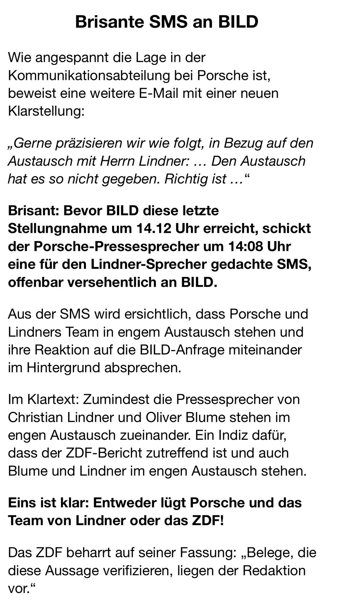 Es wird sogar noch besser, stell Dir vor, du willst dreist abstreiten, dass Porsche und Lindner in engem Austausch stehen und die Autoindustrie quasi FDP-Positionen ins Koalitionspapier diktiert, und dann schickst du aus Versehen dem Medium, dass die Sache bisher nicht aufbauscht weil der Parteichef mit ner Mitarbeiterin fickt, aus Versehen eine SMS, in der abgesprochen wird, wie man öffentlich dementiert, dass man sich abspricht. ![]()