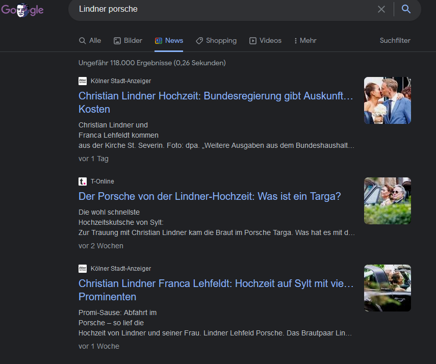 Anscheinend arrangierte er nun extra seine eigene Hochzeit, um dann dort mit einem Porsche vorzufahren, damit dann anschließend bei der Google Suche nur Nachrichten darüber und nicht über seinen Einsatz für die Lobbyisten oben stehen. Beeindruckend!