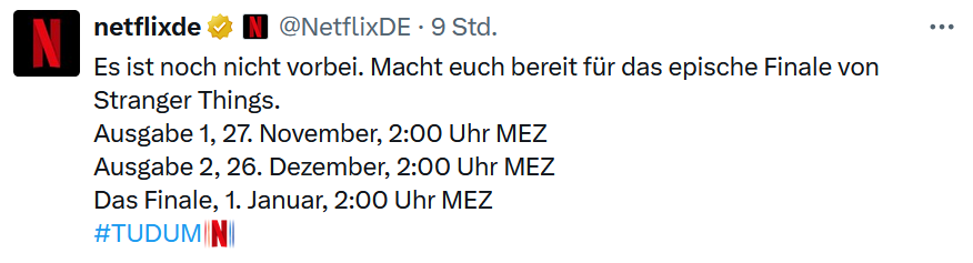 Diese Pausen, damit die Leute mehrere Monate Netflix buchen. Lieber warten, bis das alles verfügbar ist. Die 7 Folgen schaue ich mir im Januar an.