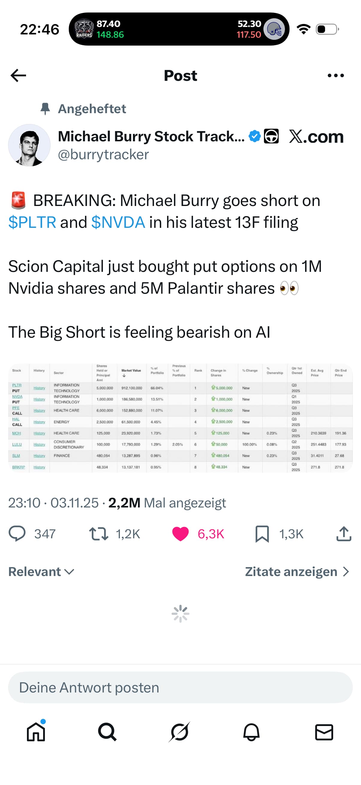 Michael Burry (der Mann, der das Platzen der Immobilienblase in den USA vorausgesehen hat und im Film „The Big Short“ porträtiert wurde) wettet im großen Stil gegen Nvidia und Palantir.