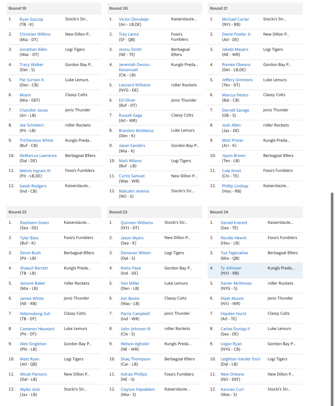 Insgesamt muss ich sagen, dass ich im Gegensatz zu den letzten Jahren nicht wirklich zufrieden bin. Meine Strategie, früh WR aufzuladen und mich um RB später zu kümmern und den einen RB Slot, den wir haben, mit Committee Backs oder 3rd Down Backs zu besetzen, habe ich völlig ohne Not über Bord geworfen, obwohl ich die letzten Jahre immer Erfolg damit hatte. Jetzt hängt die Saison am seidenen Faden Kreuzband von Saquon. Und irgendwie fehlt mir auch die Upside wenn man mal von ToJo absieht. Alles sehr sehr meh. Würde mich nicht wundern, wenn ich dieses Jahr das erste mal die Playoffs verpasse.