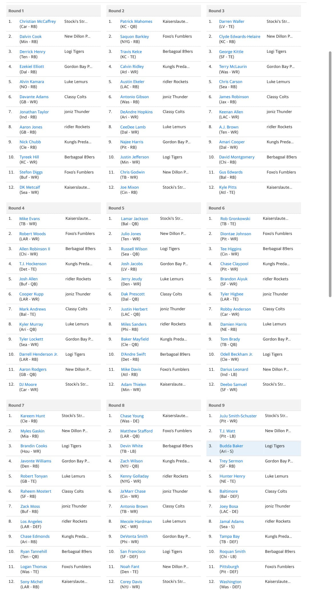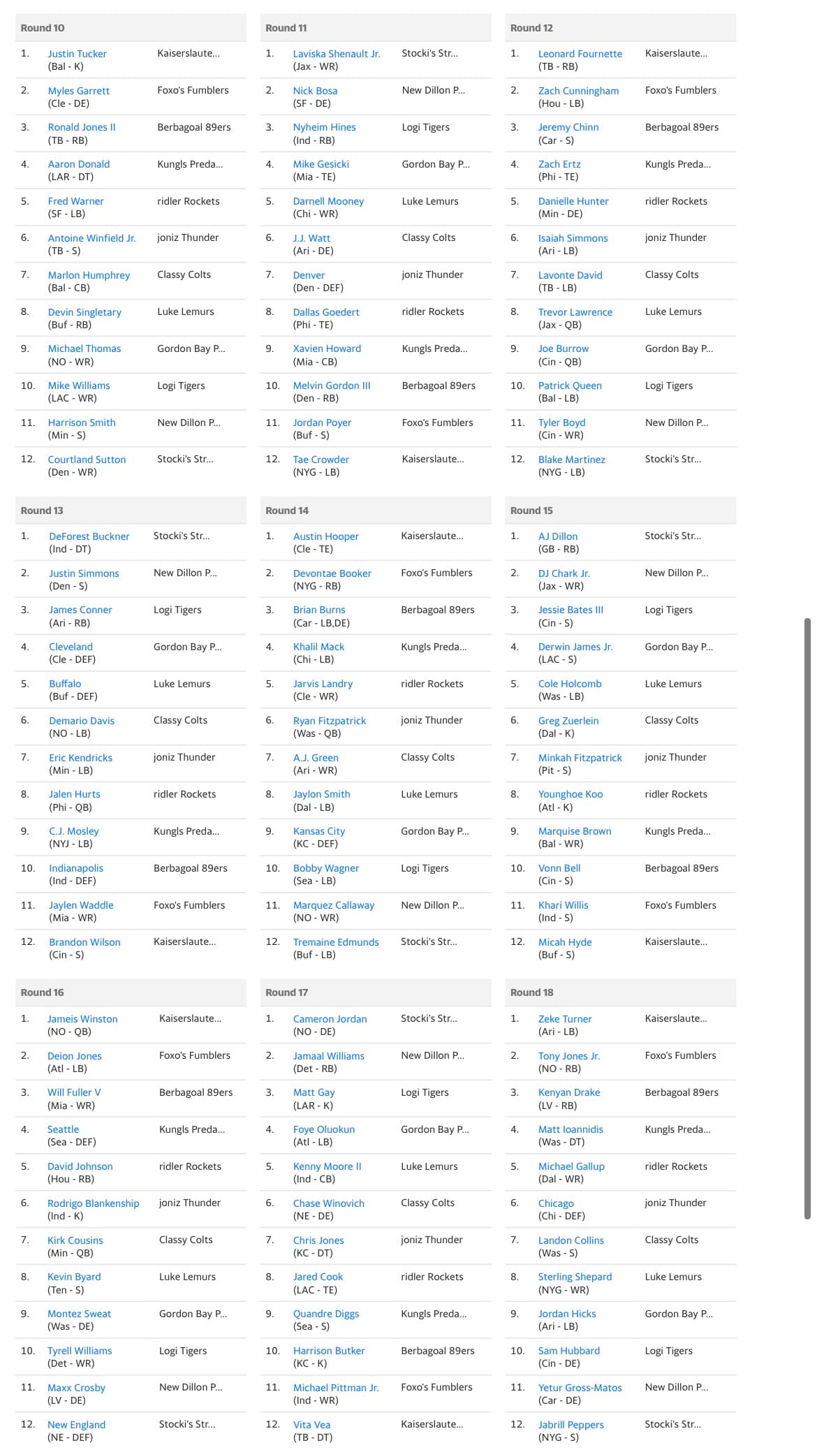 Absolut zufrieden mit meiner Auswahl hier. Wenn ich in Runde fünf noch KyMu oder Lamar bekommen hätte, oder Rodgers in Runde sechs, dann wäre meine Wahl auf die gefallen. Ansonsten war tatsächlich der Plan, spät Stafford zu holen. Am Ende war ich der letzte, der noch keinen QB gepickt hatte und konnte mir daher noch einen Turn mehr Zeit lassen. In meinen Augen ein Lock für ein Top 10 QB Finish mit Upside ein Top 5 QB zu sein diese Saison. Trey Lance in Runde 20 war dann so ein blinder „Ja komm, vielleicht wird das ja der nächste Mahomes“ Pick. Mal schauen. Wahrscheinlich eher ein Kandidat für einen frühen Drop.