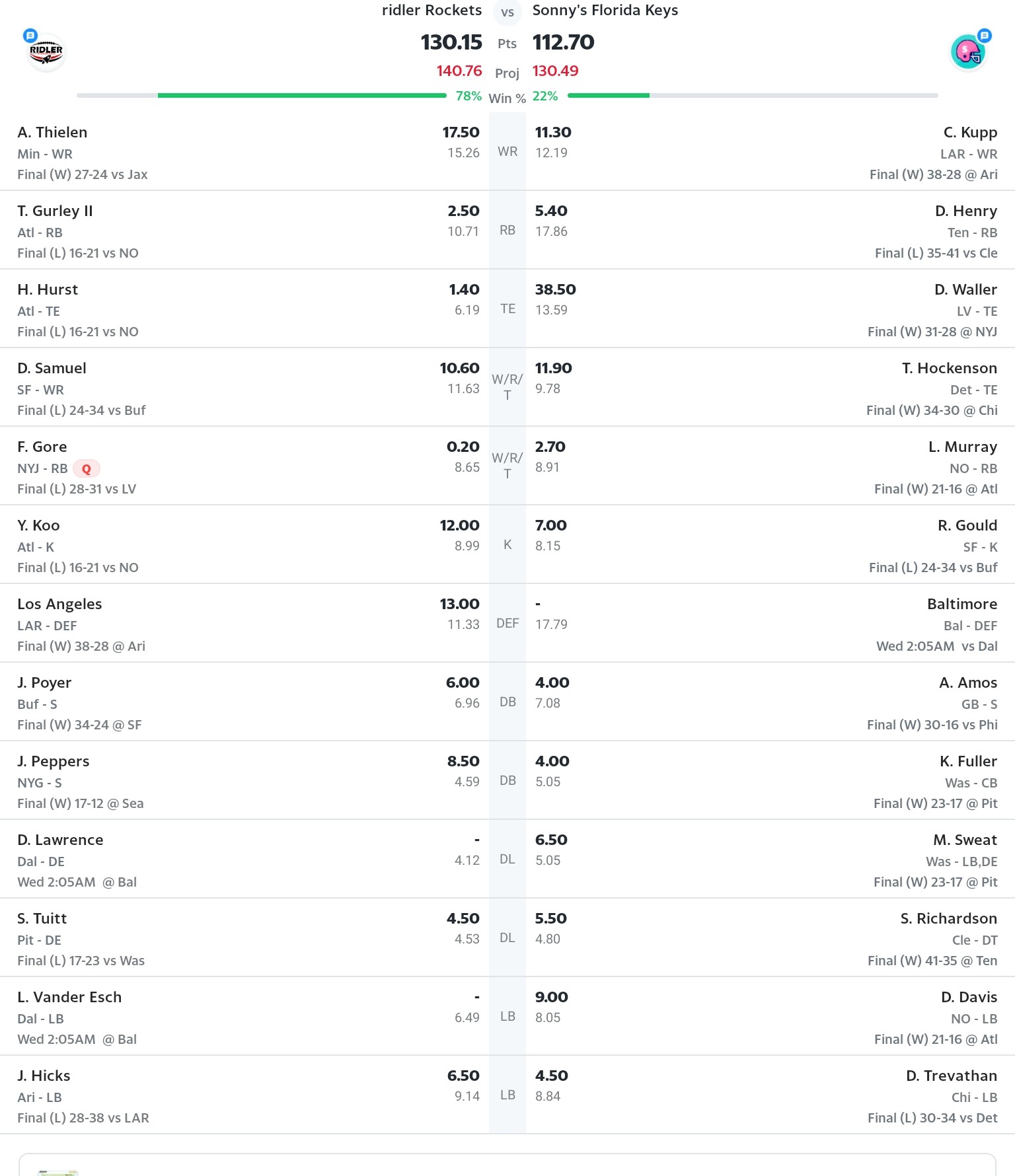 Wir sollten am besten erstmal abwarten wie das Ergebnis aussieht, solange Sonny sich hier nicht äußert. Dann wird die ganze Diskussion vielleicht eh hinfällig. Die Projections sehe ich bei seinen restlichen Spielern eher am unteren Ende an. Gerade die Ravens werden vermutlich noch ordentlich durchdrehen.