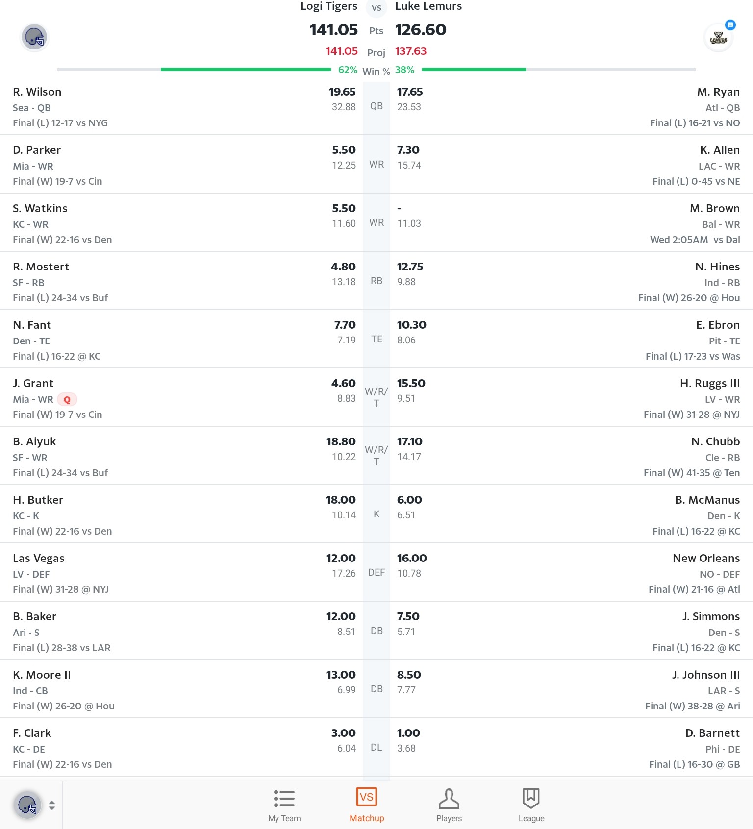 Diese Woche wäre ich selbst schuld aber vor 2 Wochen hatte mein Gegner einen überraschend überragenden Watson und letzte Woche gegen einen 50+ Tyreek war auch nix drin. Vor den Duellen war mein Team immer auf Augenhöhe, danach sah das zumeist anders aus. ![]()