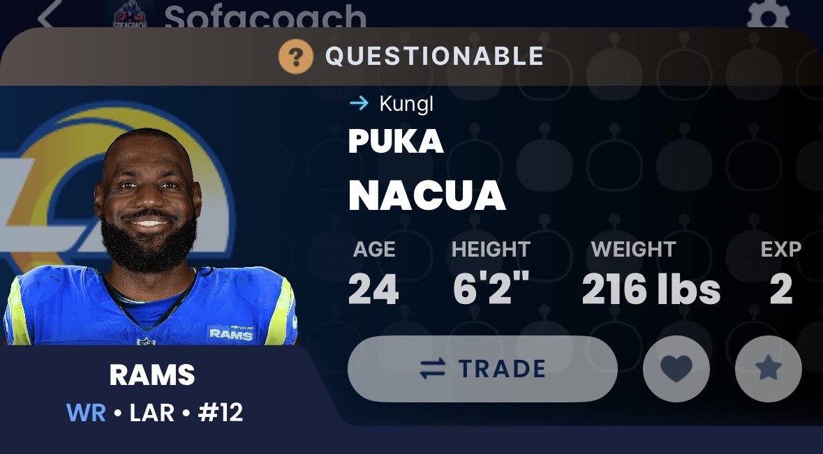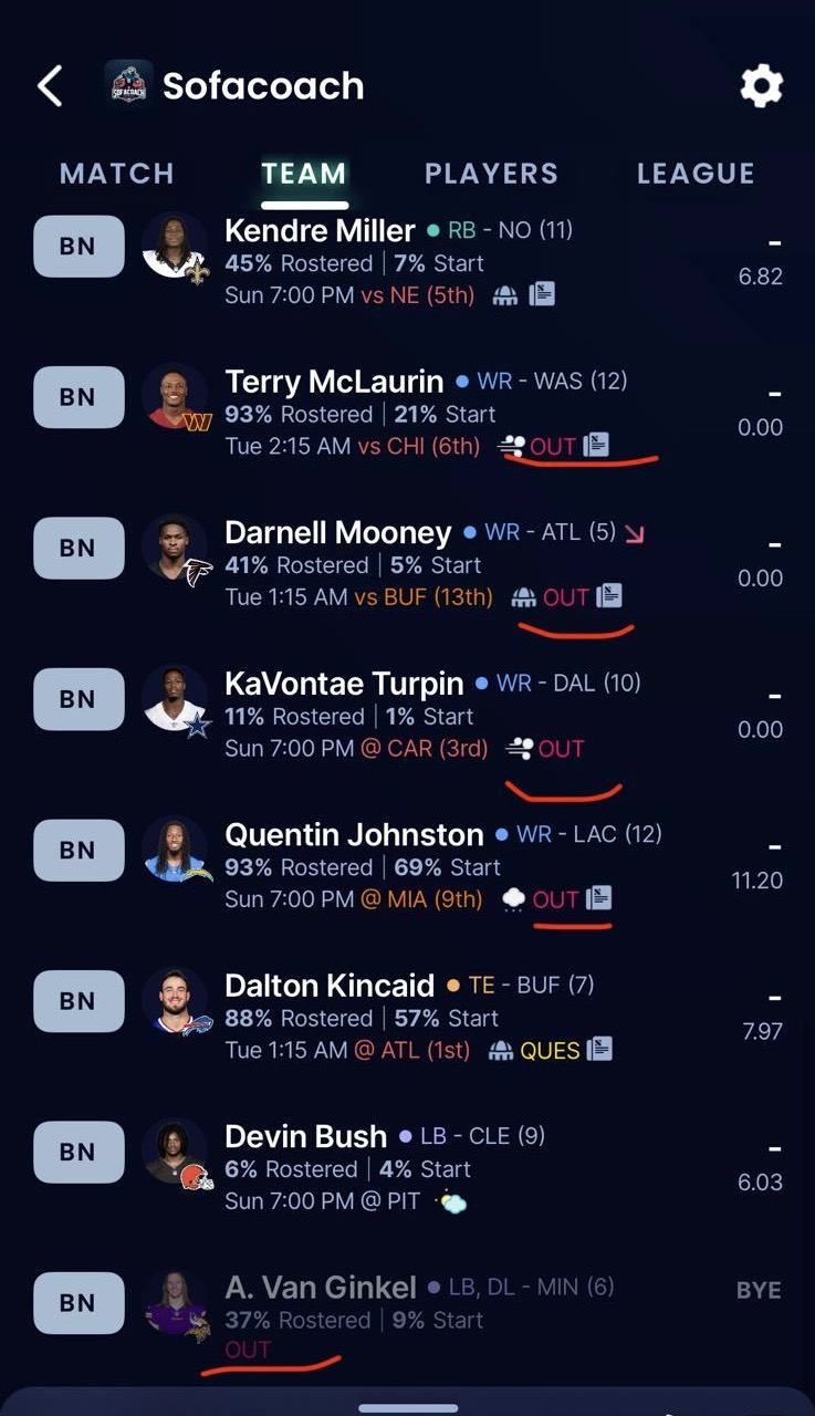 - Woche: B. Bowers (LV - TE) out im W/R/T-Slot, R. Smith (BAL - LB) out im LB-Slot (Scott Matlock weiterhin im DL-Slot)