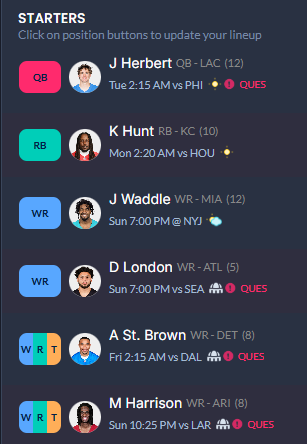 Bijan an #2 war sicherlich Konsens& auch keine Enttäuschung, das war schon ordentlich als RB#5. Aber das war es dann halt auch, Kamara durch und in einer desolaten Saints Offense, die Vorliebe für rookie RBs sollte sich ebenfalls nicht ausgehen, da nur Monangai jetzt startbar wird. Insbesondere JCM in Rd10 mit nur einem double digit Game ein fehlgeschlagener gamble. Alle rookies schon früh vom roster, nur den Bären hatte ich vor kurzem wieder geholt.
