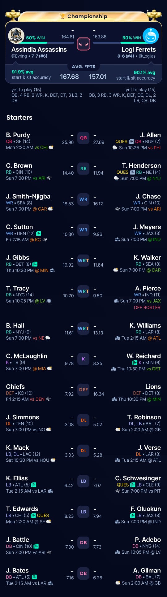 Der eigentliche Punkt, an dem die Saison gekippt ist, kam dann in Week 15. Kyle Pitts sowie die Chiefs Defense per Waiver und, noch wichtiger, Brock Purdy für 3 $. Das war der Moment, an dem aus einem guten Team ein Titelteam wurde. Nicht, weil vorher alles schlecht gewesen wäre, sondern weil kurz vor Schluss noch genau die richtigen Teile ergänzt wurden.