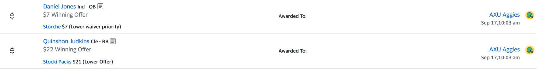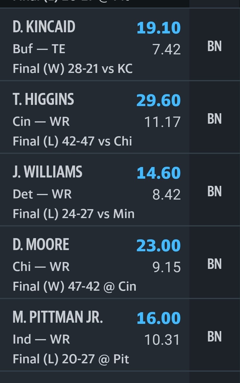 Ich hatte mich erst geärgert, weil ich ausversehen einen Spieler der in der Bye ist, im Line Up hatte. Meine Alternative wäre aber Garrett Wilson gewesen, also ist der Punkte Output der gleiche ![]()