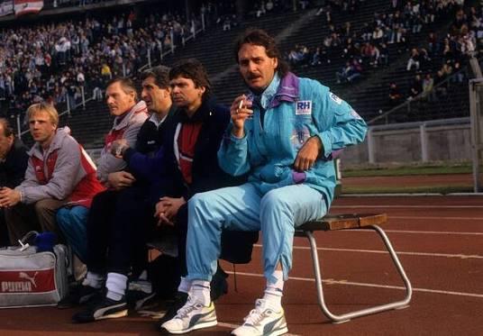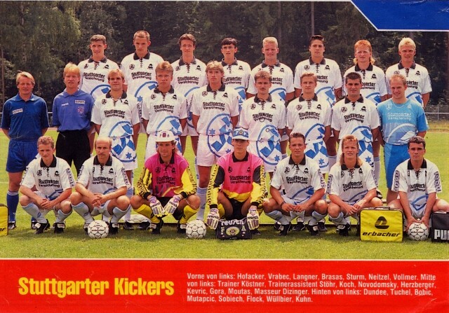 Man beachte links hinten in einer Reihe die jungen Sean Dundee, Thomas Tuchel und Fredi Bobic. Vorne rechts Karsten Neitzel mit Vokuhila. In der Mitte steht ganz gefasst Janusz “Skandal” Góra. Hinten rechts mein persönlicher Liebling damals: Dirk Wüllbier. Eine knallharter Wadenbeißer der ganz alten Schule - sammelte in seiner Zeit bei den Blauen insgesamt 13 Platzverweise ![]()