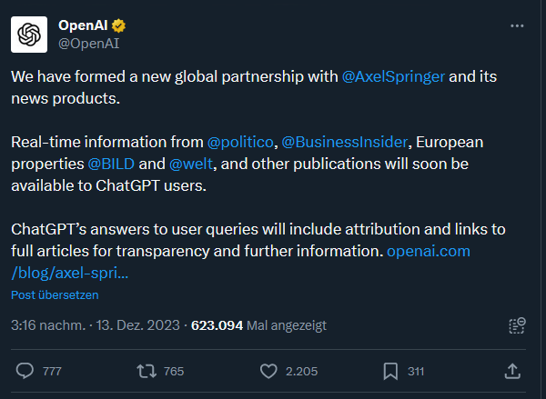 An sich nix besonderes, ChatGPT scraped ja heute schon die genannten Seiten live. In Zukunft wird es aber bestimmt so sein, dass wer am meisten zahlt, auch am stärksten den Output steuern kann. ![]()