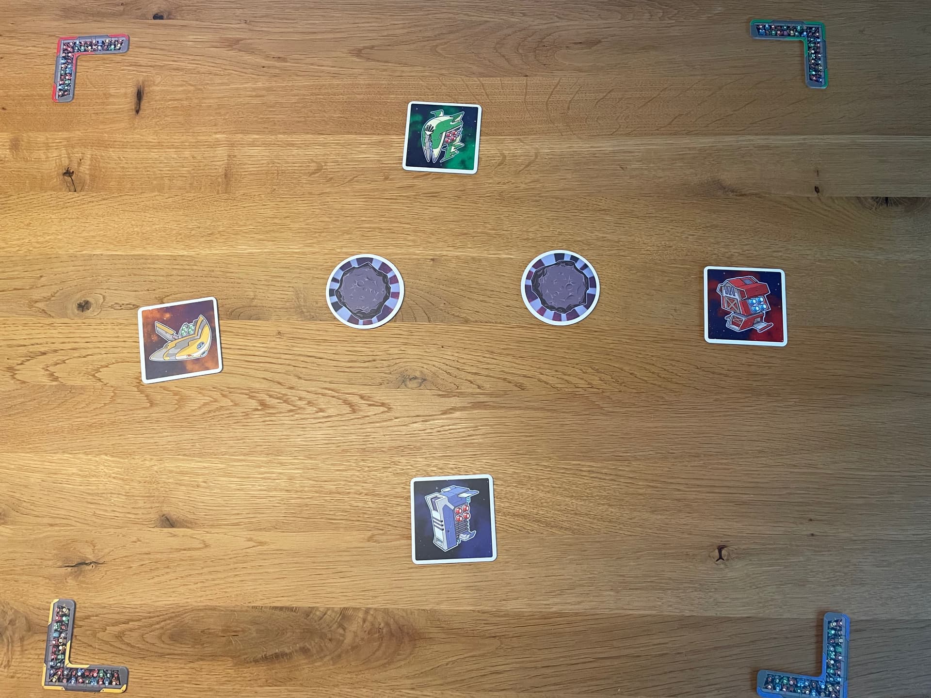 Vor Spielbeginn wird ein Rechteck mit 4 Markern abgesteckt, in der die Action stattfindet. Dort legt jeder seine Basis-Raumstation rein (die gilt es zu schützen) und es werden 2 Meteore platziert.