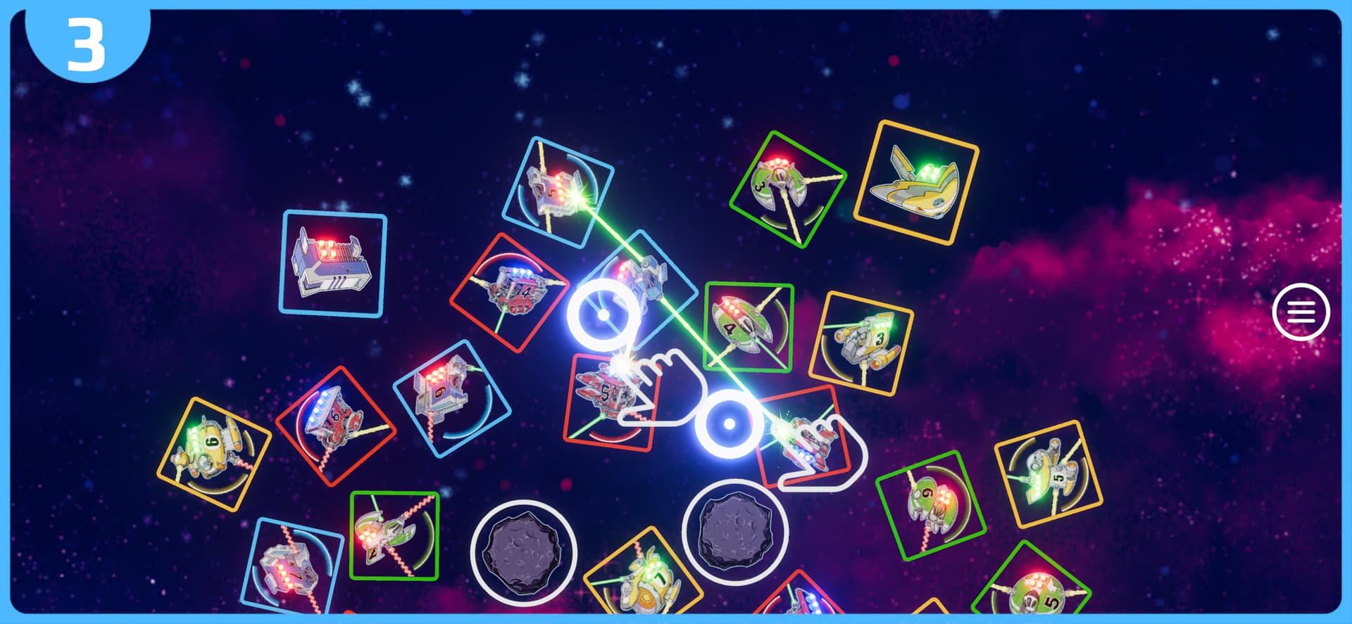 Das Spiel könnte einfacher (und kürzer) nicht sein: Jeder Spieler hat eine Raumstation und bis zu 8 laserschießende Raumschiffe mit den Nummern 1-8, einer Lebensanzeige und verschiedenfarbigen Lasern.
