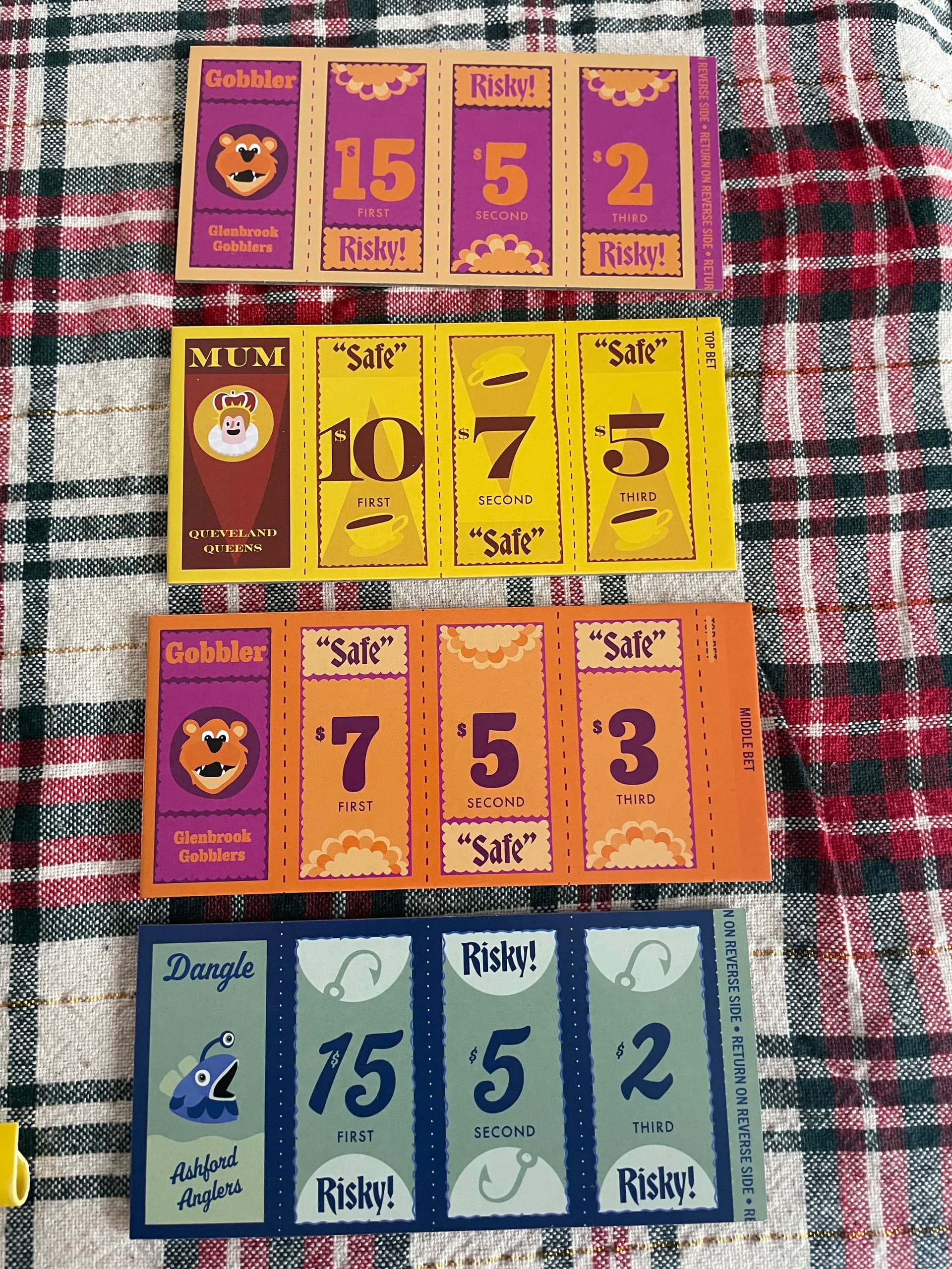 Bevor es aber losgeht mit dem 1. von drei Rennen wird gewettet. Abwechselnd sichern sich alle Spieler zwei Wettscheine, um auf bestimmte Figuren oder Ereignisse zu wetten. Man kann diese auch umdrehen, um mehr Risiko zu gehen (gewinne noch mehr Geld oder verliere bei Niederlage welches).