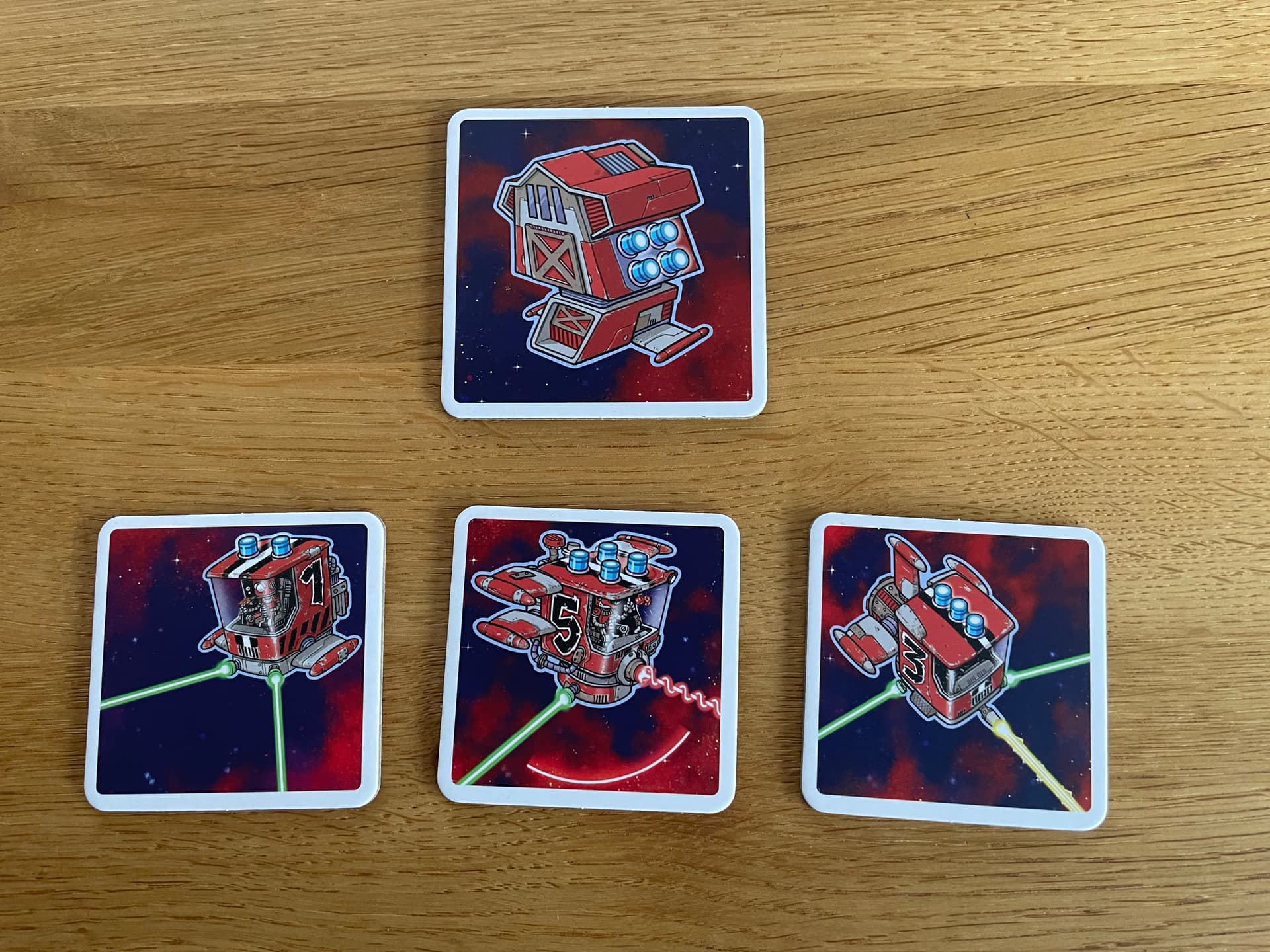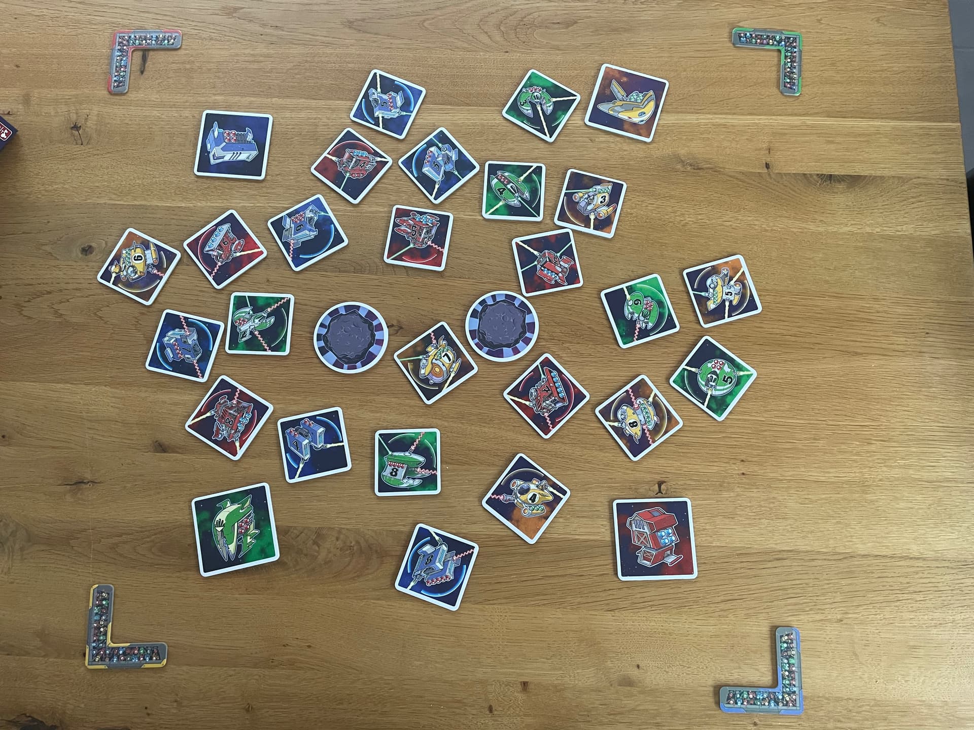Dann gehts auch schon los: Auf Signal der App legt jeder innerhalb von 10 Sekunden einer seiner Karten in die Spielfläche und versucht sie so zu platzieren, dass die Laser die gegnerischen Raumschiffe/Raumstationen treffen. Jedes Raumschiff hat gewisse Lebenspunkte, ein Treffer eines grünen Lasers zieht ein Leben ab, ein gelber zwei und ein roter sogar drei. Nach 10 Sekunden dann die nächste Runde, dann die dritte und nach ner Minute hat jeder seine Raumschiffe platziert: