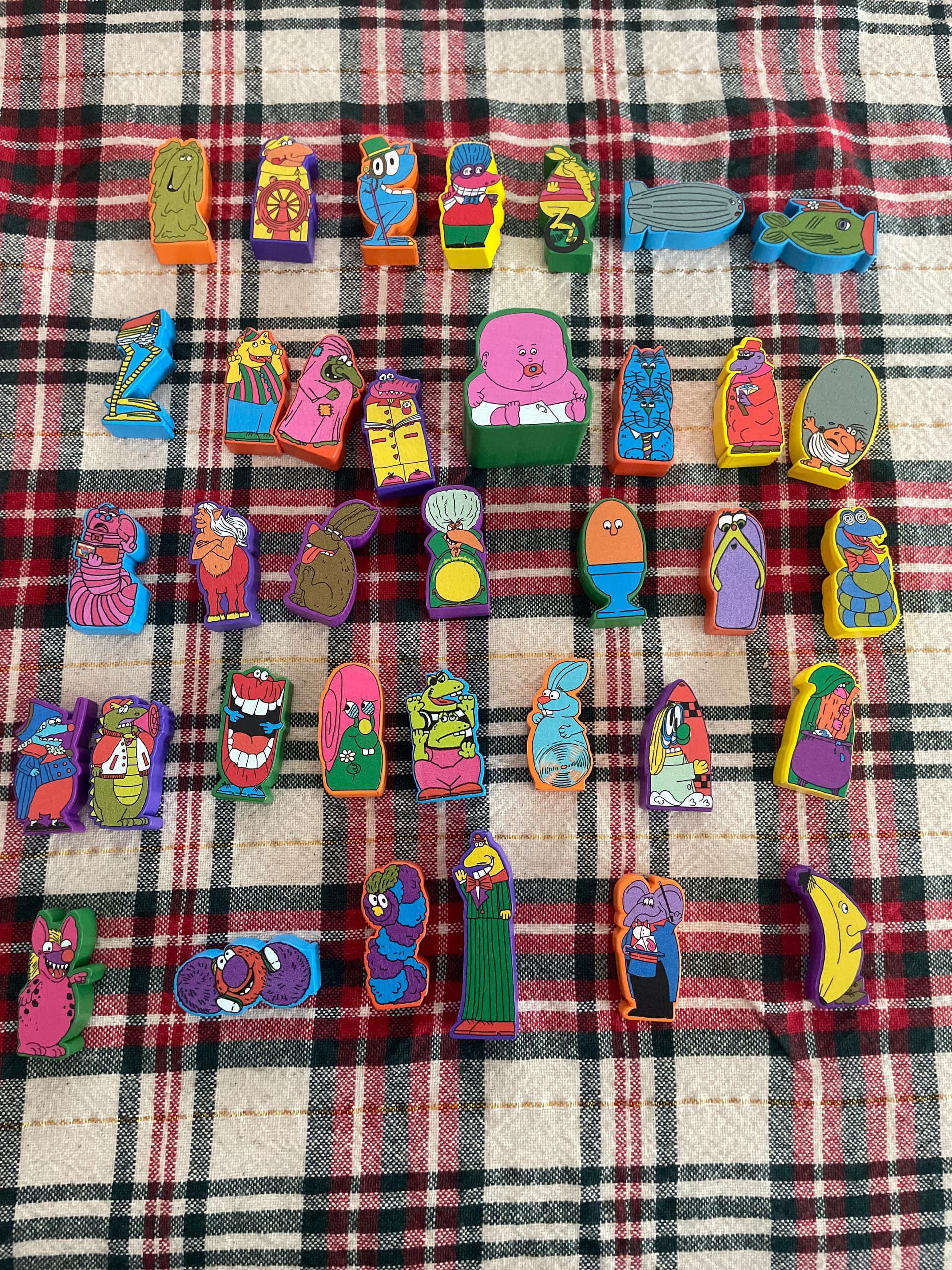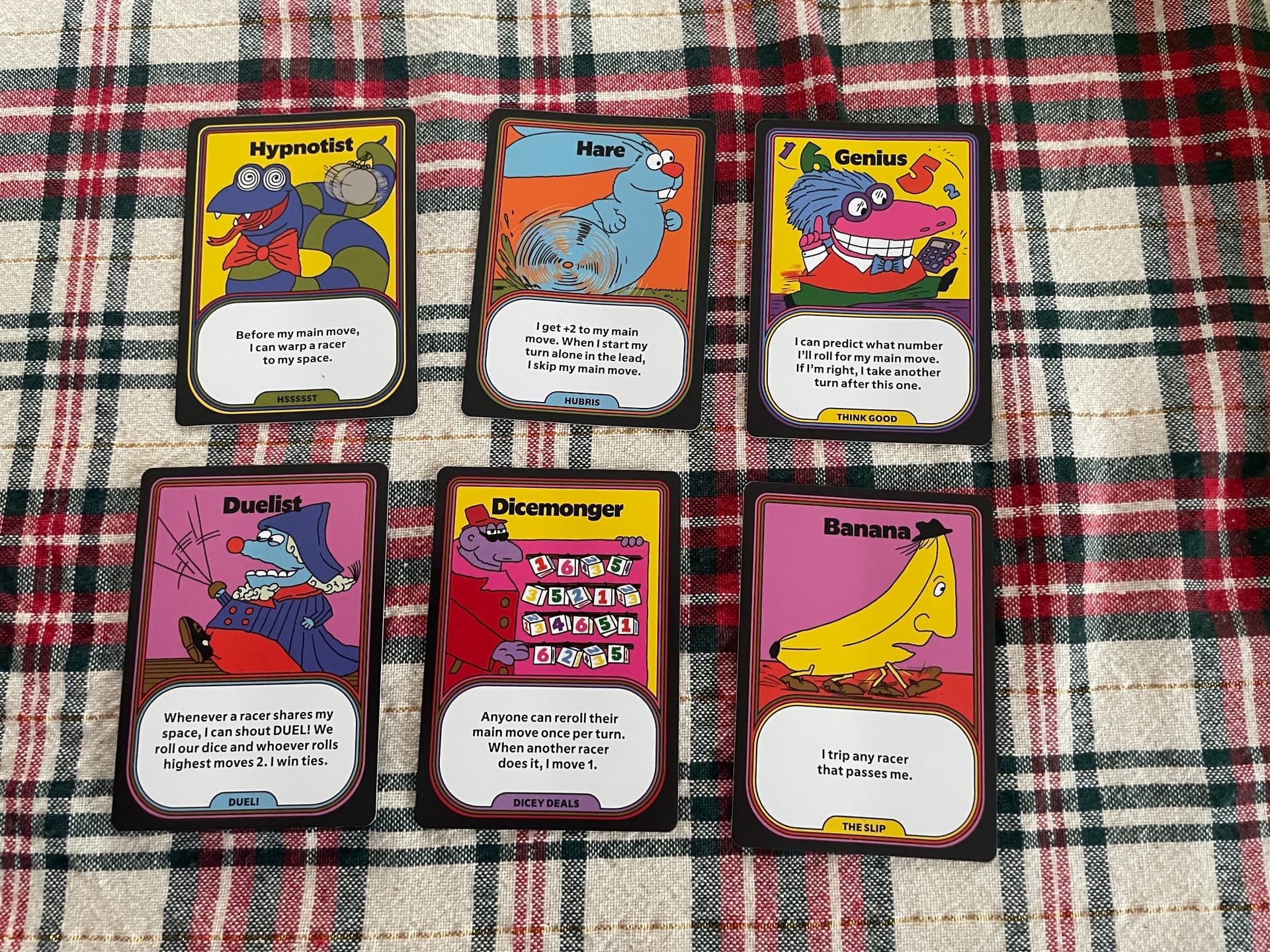 Aber, und das ist das große Aber: Jede Figur hat zum Teil lächerlich starke Eigenschaften. Da gibt es „Legs“, der einfach immer 5 nach vorne ziehen darf. Flip Flop darf mit anderen die Plätze tauschen. Suckerfish kann sich einfach an andere dranhängen. Der Zentaur kickt beim Passieren andere nach hinten. Das Riesenbaby blockiert das ganze Feld. Und so weiter. Es ist absurd. Es gibt 36 (!) Figuren, und jeder Spieler draftet sich anhand der ausgelegten Karten zu diesen Figuren sein Team aus 4 , die jeweils in einem der vier Rennen starten.