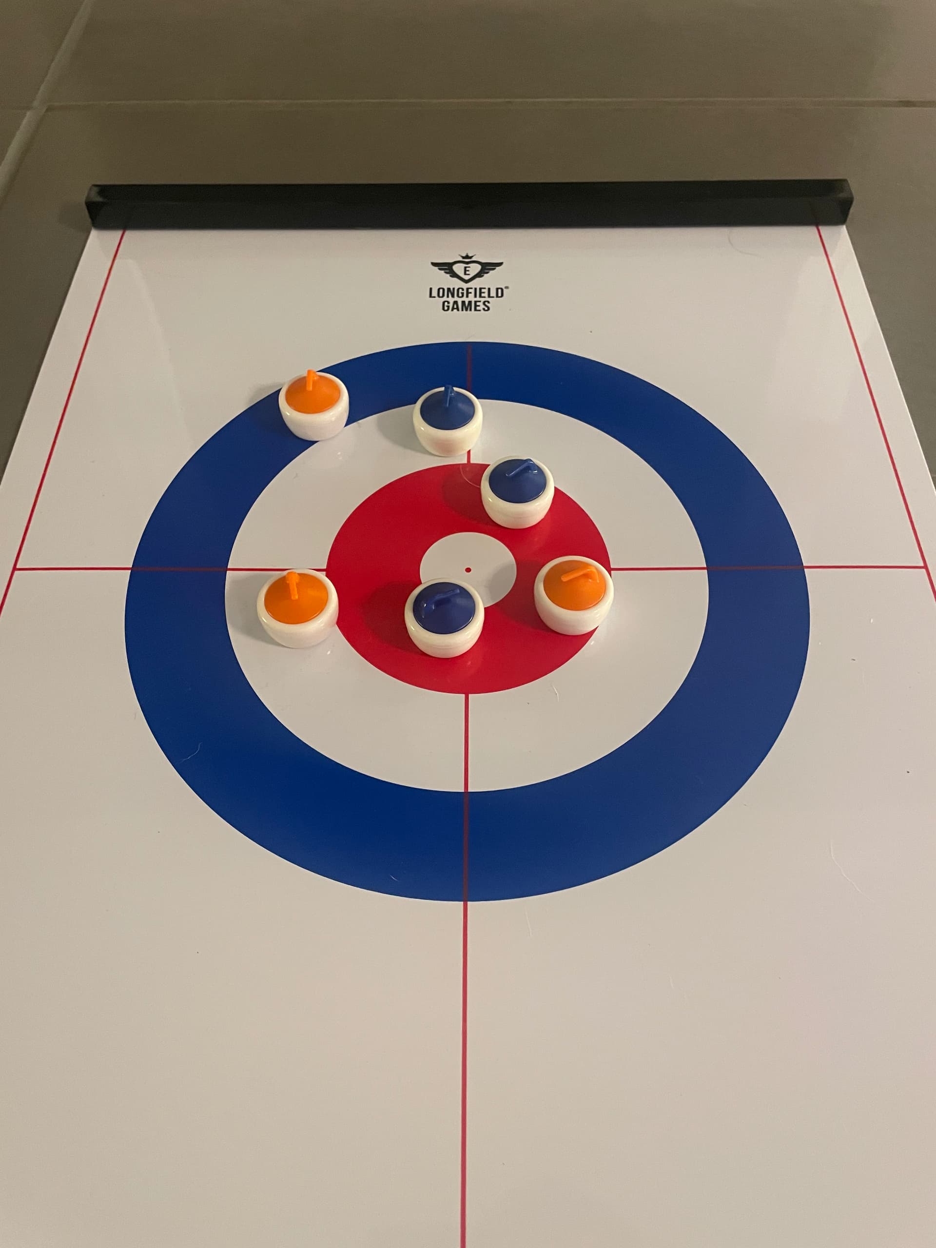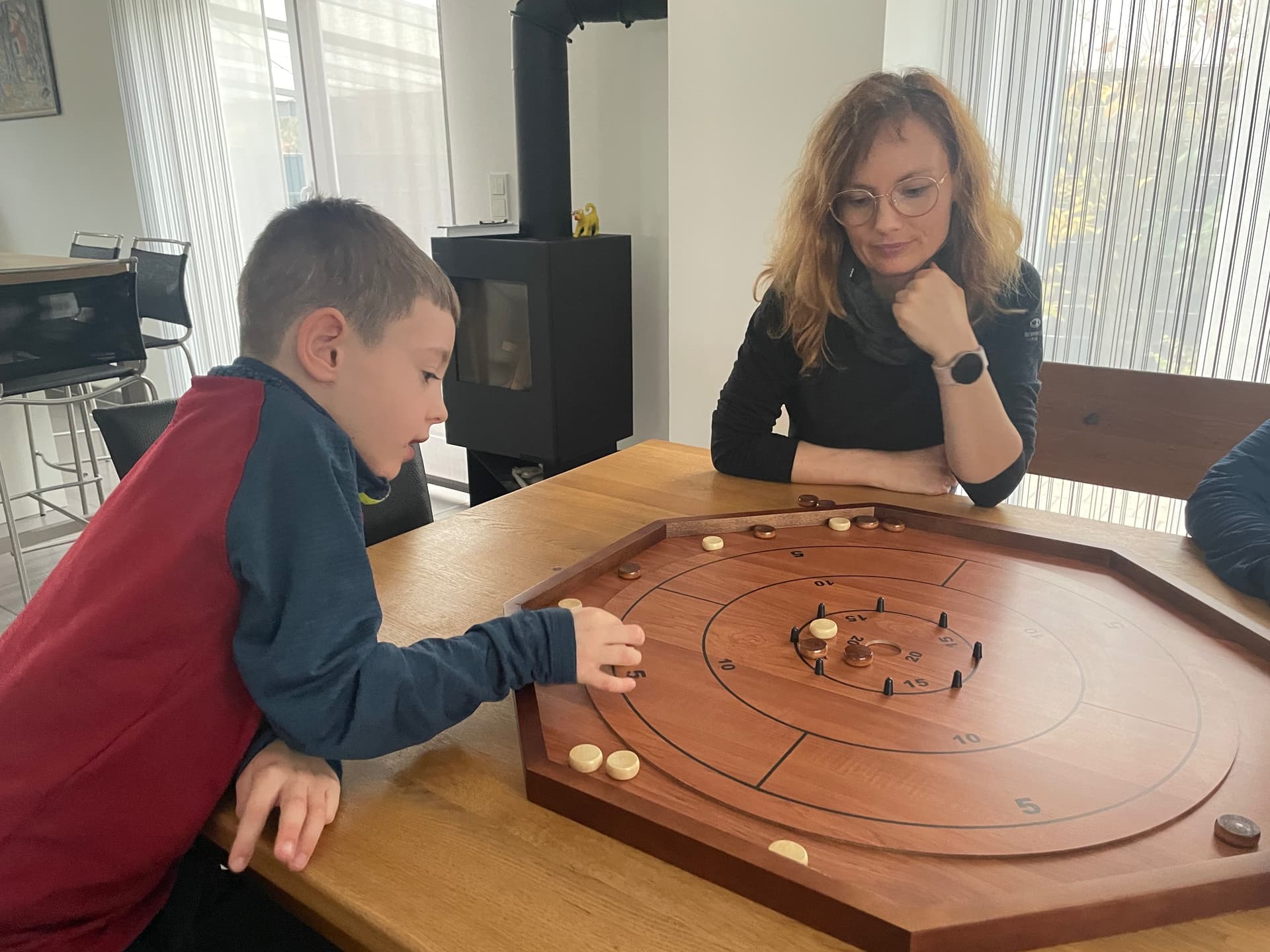 Unangefochten an der Spitze, entstanden im 19. Jahrhundert in Canada, die Spieler versuchen abwechseln einen Spielstein genau in das Loch in der Mitte zu schnippsen. Gelingt das bekommt man 20 Punkte, ansonsten muss der Stein zumindest im Mittelkreis liegen bleiben und der Gegner muss zuerst den gegnerischen Stein anspielen, um den eigenen zu platzieren. Punkte gibt es am Schluss auch für liegengebliebene Steine, je nachdem wie nahe sie am Loch liegen. Durch die 8 Metallpfosten als Hindernis in der Mitte ist es taktischer als man denkt, irgendwann hat man den Dreh raus und überlegt, wie man den Gegner das Anspielen des eigenen Steins so schwer wie möglich machen kann, zB durch Verstecken hinter dem Pfosten. Wir lieben es.
