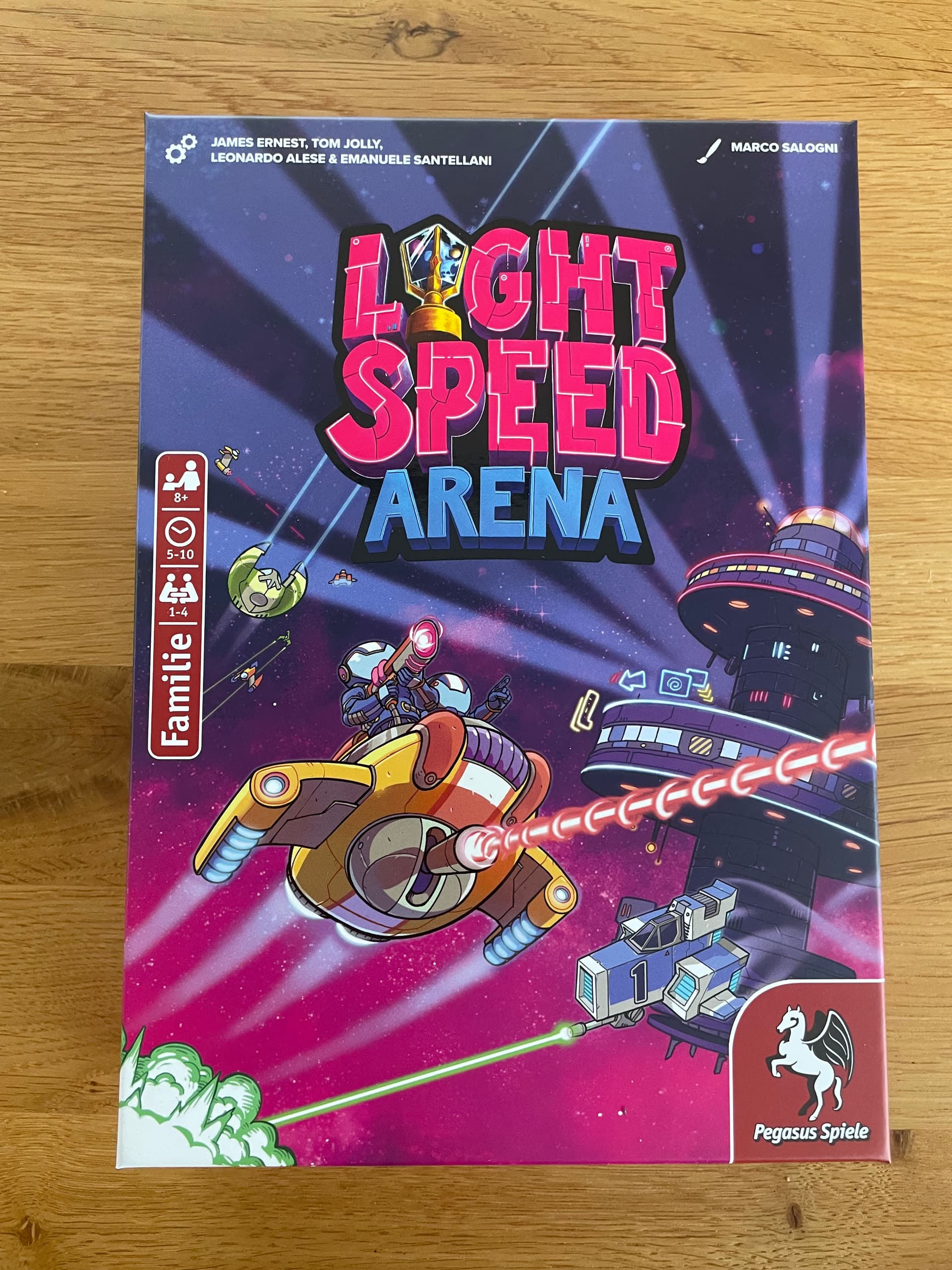 Weiter bei den Essen Messeneuheiten. Pegasus setzt im Familienbereich vermehrt auf App-unterstützte Spiele (z.B. auch Boss Fighters QR, das ich später mal vorstelle) und das klappt bei Light Speed Arena auch erstaunlich gut.