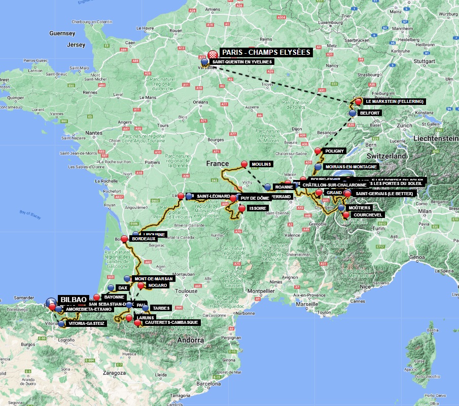 Neben den anfänglichen Pyrenäen führt die Tour dieses Jahr zudem über das Zentralmassiv, der Jura, den Alpen und den Vogesen.