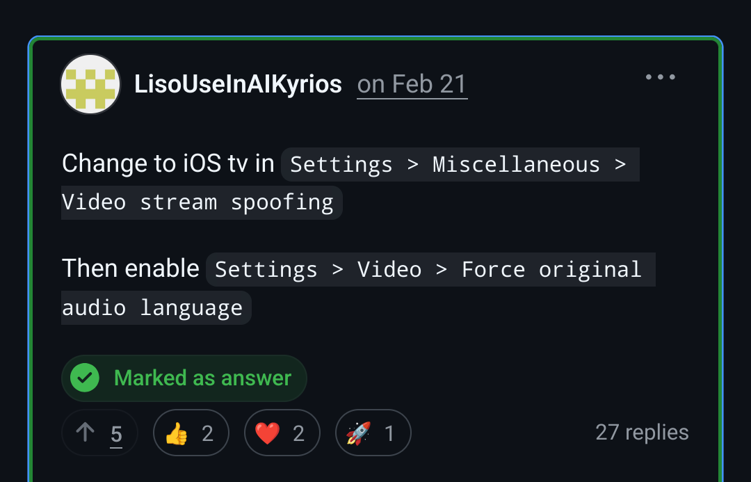 Dann dem Link folgen und hier landen: bug(YouTube - Force original audio): Some videos use auto-dubbed translated audio (iOS TV client does not work) · Issue #5156 · ReVanced/revanced-patches · GitHub