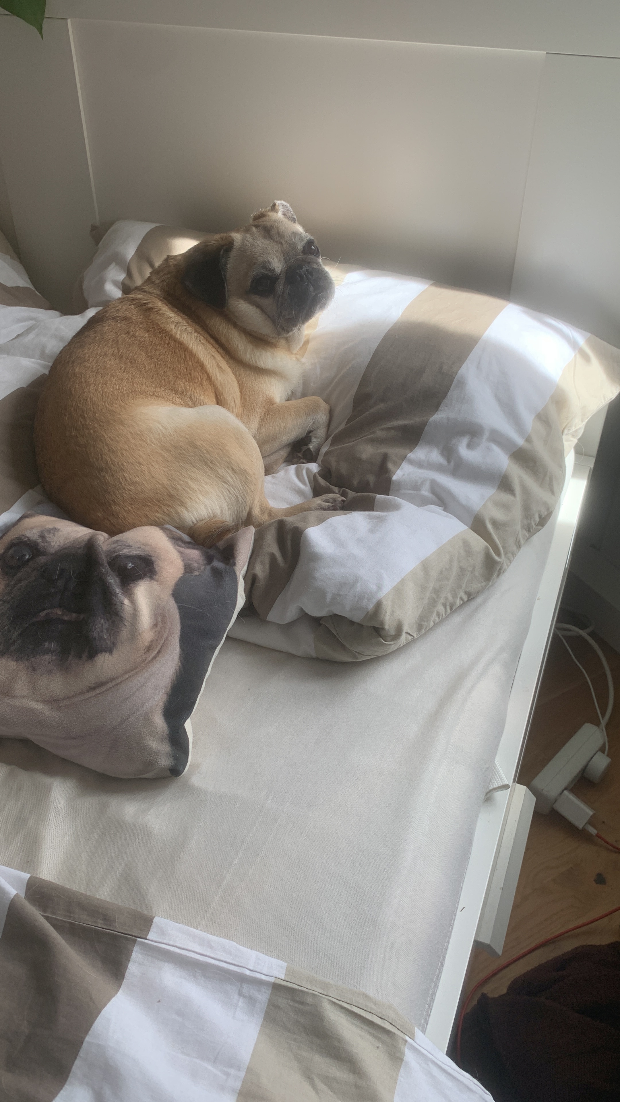 Von einem Kumpel mal zu Weihnachten dieses Kissen mit nicht so tollen Foto von Monty bekommen, welches wir auch oft als Sticker nutzen