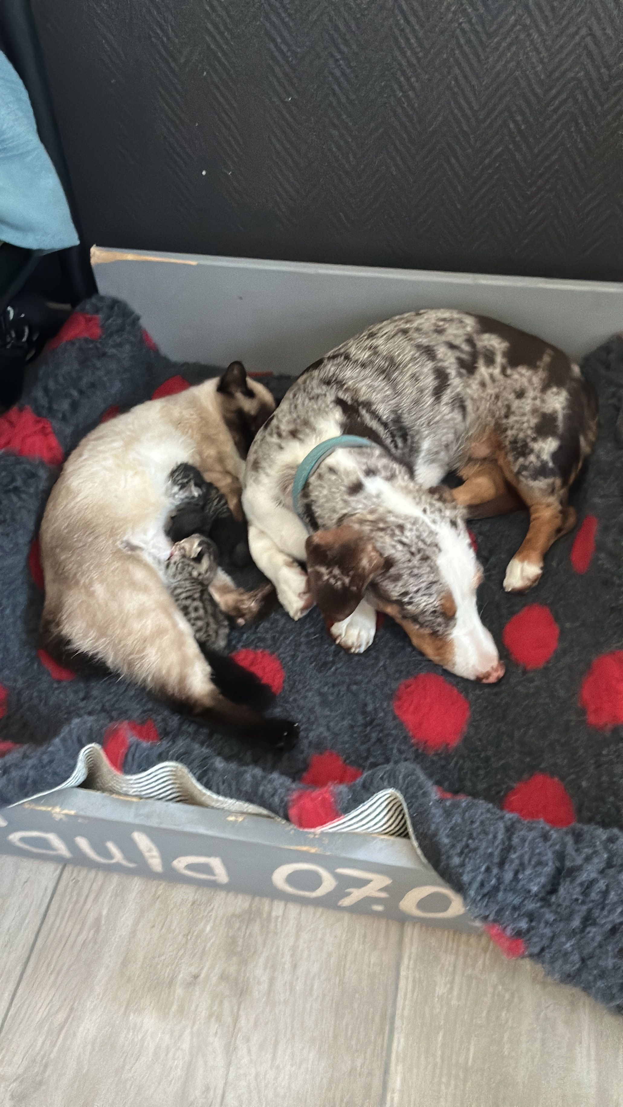 Es gibt Nachwuchs. Und der Halb-Wiener macht einen auf Tante und Babysitter. Weicht der Katze und ihren drei Babies nicht mehr von der Seite. ![]()