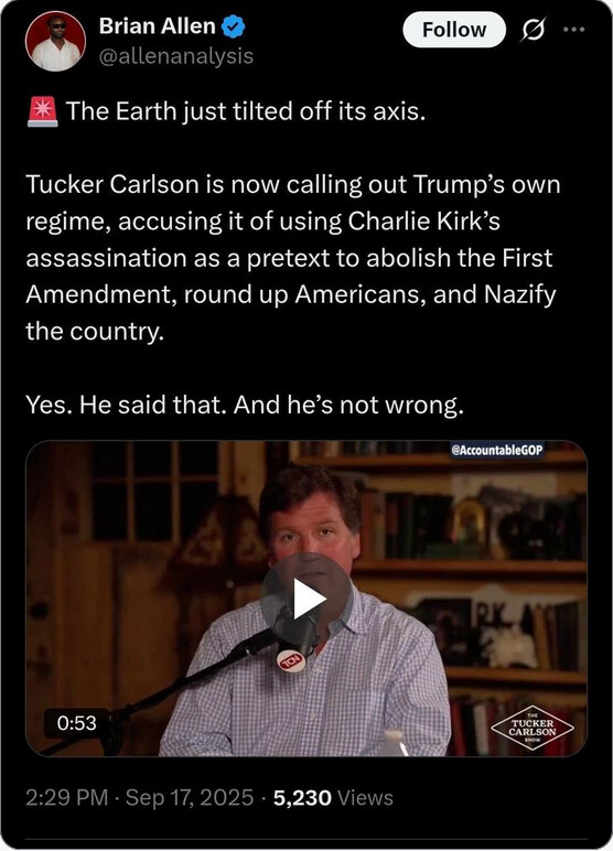 Am Faszinierendsten ist die Wendehalsigkeit dieser MAGA Idioten. Von „free speech absolutist“ und „cancel culture“ Geschwafel hin zum „Snowflake“ und „words have consequences“ in wenigen Stunden. In dieser Geschwindigkeit dann doch überraschend. Die Scheinheiligkeit bleibt unübertroffen. Bei Fox News fabuliert Kilmeade darüber, Obdachlose gezielt totzuspritzen. Nix passiert. Es ist ihnen einfach egal. Aber Kirk zu zitieren reicht schon aus als Provokation.