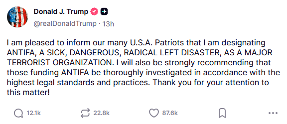 Da die Antifa ja keine Organisation ist und dementsprechend es auch keine Abgrenzung Antifa-Mitglied/kein Antifa-Mitglied gibt, bleibt es wohl dem DOJ überlassen, zu definieren, wer Antifa ist und wer nicht. Das eröffnet völlig neue Möglichkeiten an Repressionen gegen alles, was irgendwie “links” ist.