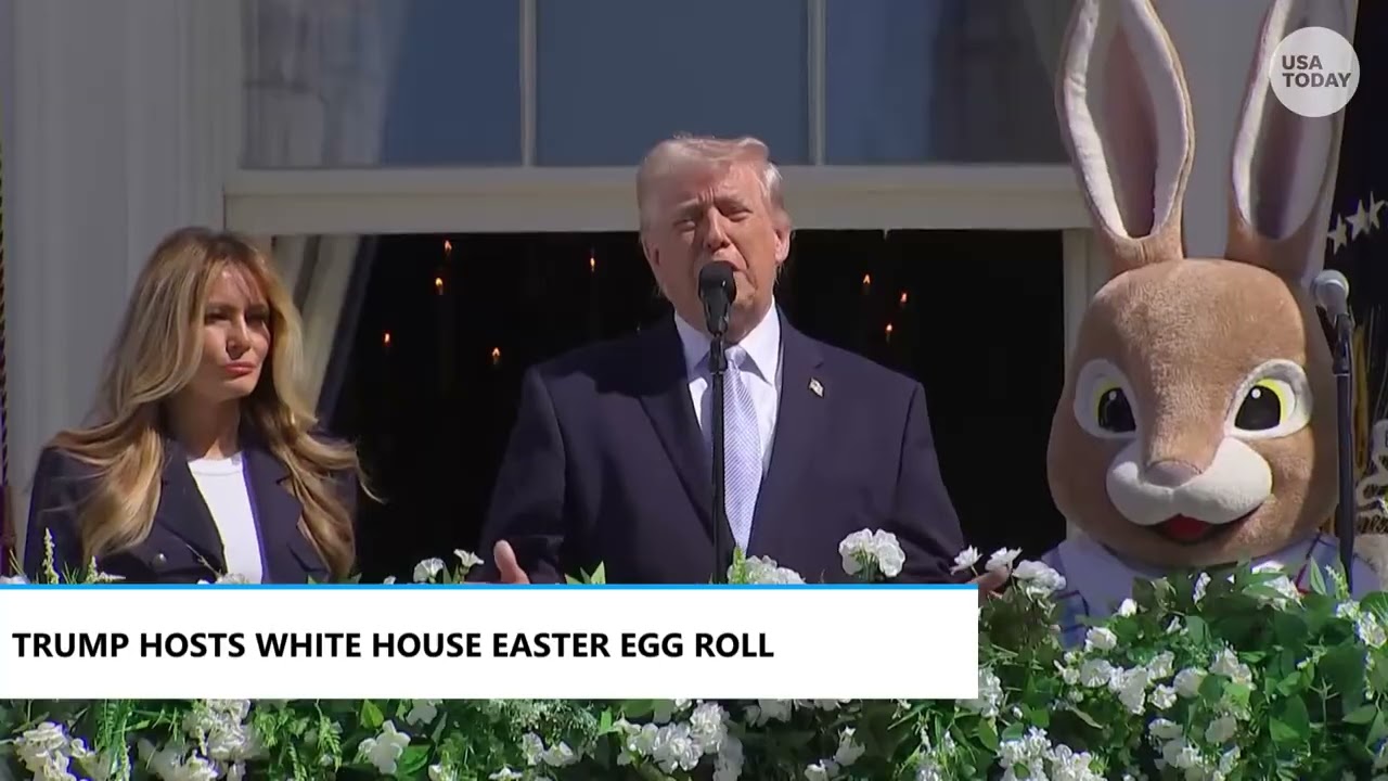 Trump spricht über den Irankrieg und Eierpreise direkt neben einem lustigen Osterhasen.